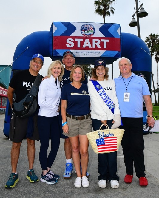(Left to right) Honorary Palisades Co-Mayor Ted McGinley, Sheryl Bourgeois, CEO Saint John’s Health Center Foundation, Announcer Sam Lagana, Councilmember Traci Park, Co-honorary Mayor Gigi Rice and announcer Jimmy Dunne.