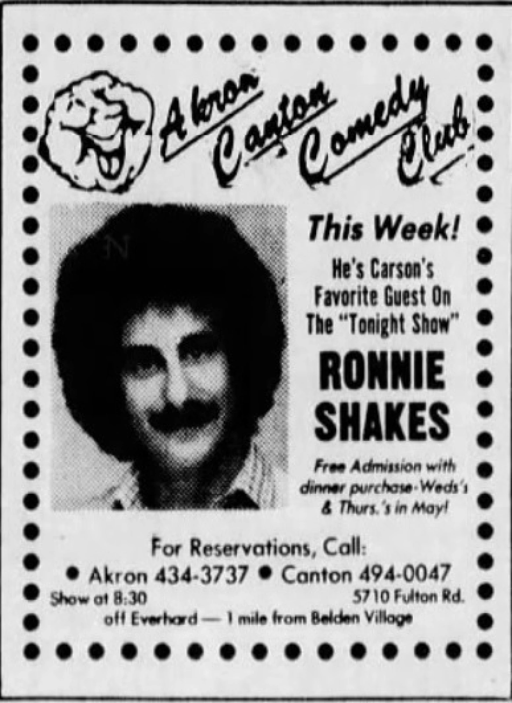 Ronnie Shakes was booked for a week of shows at the Akron Canton Comedy Club, then on Fulton Drive NW in Jackson Township in May 1987.