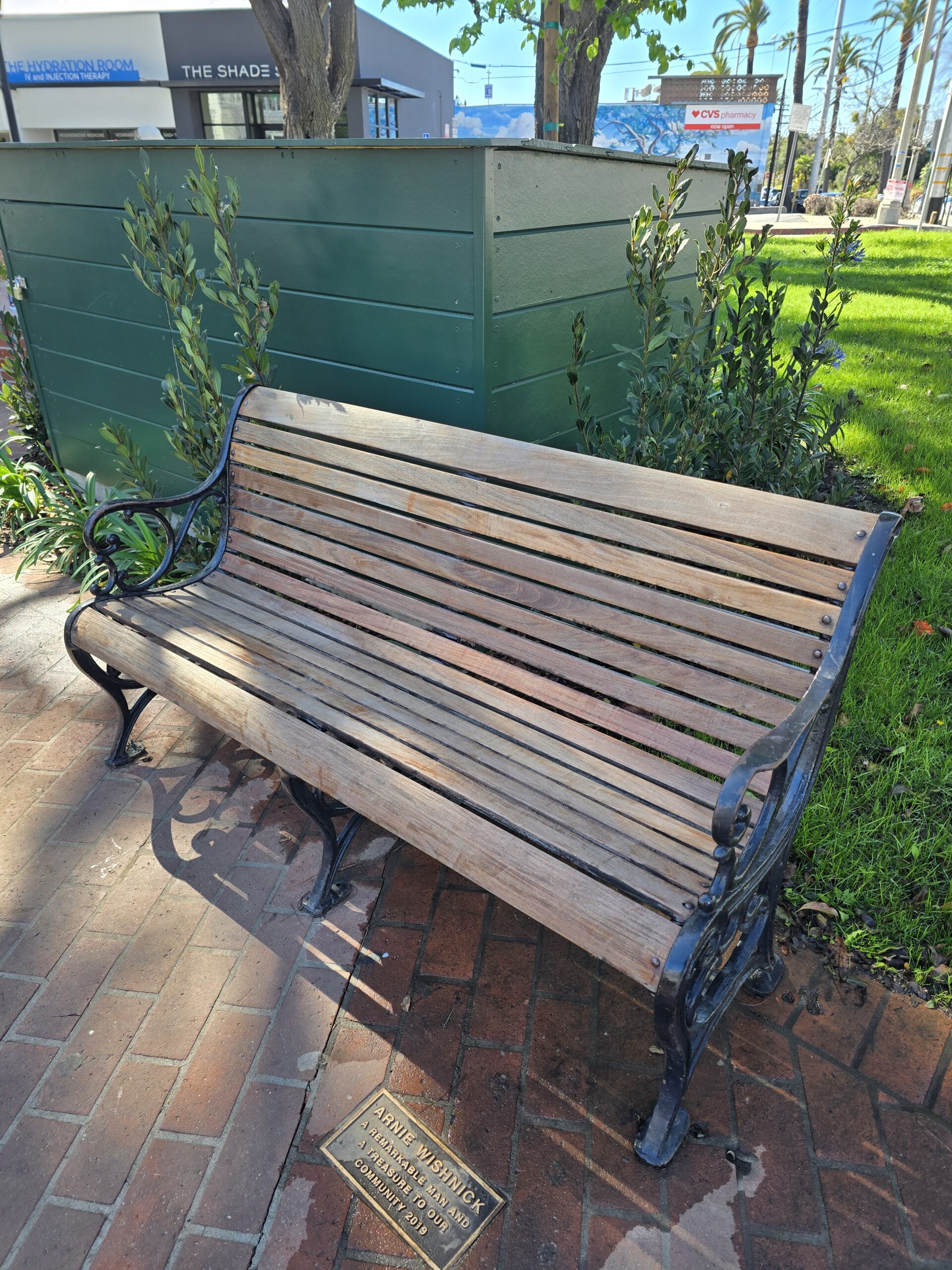 The photo shows a bench that was put in place for beloved Chamber of Commerce Executive Arnie Wishnick, who also served on the Village Green Board for years. The late Wishnick is probably beaming and would have had nothing but congratulations for these young men for their excellent job.