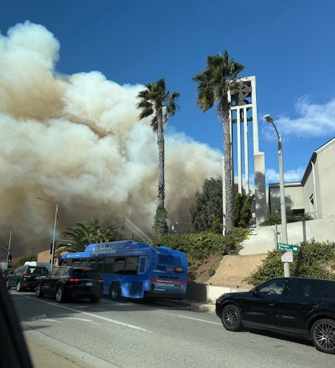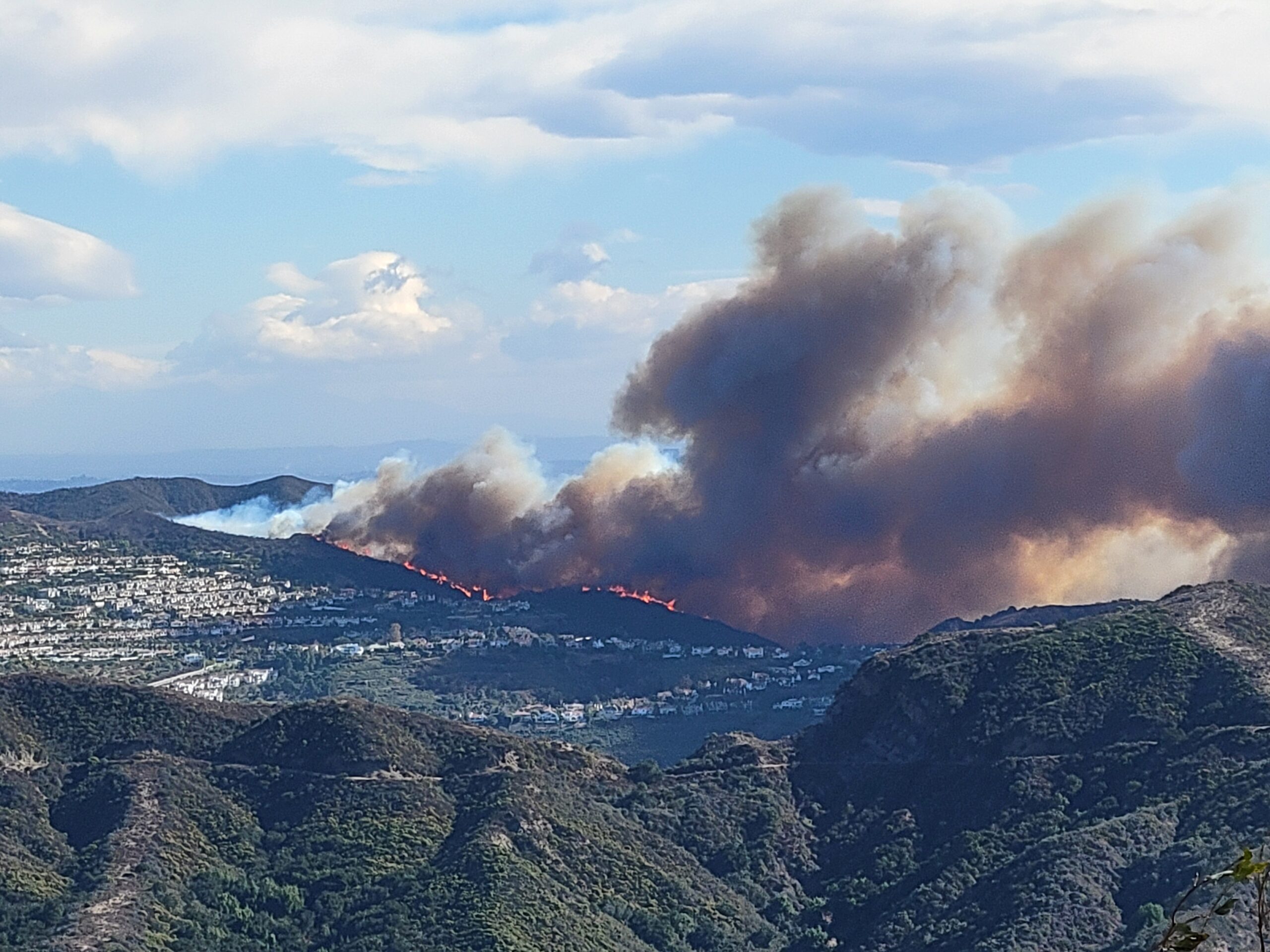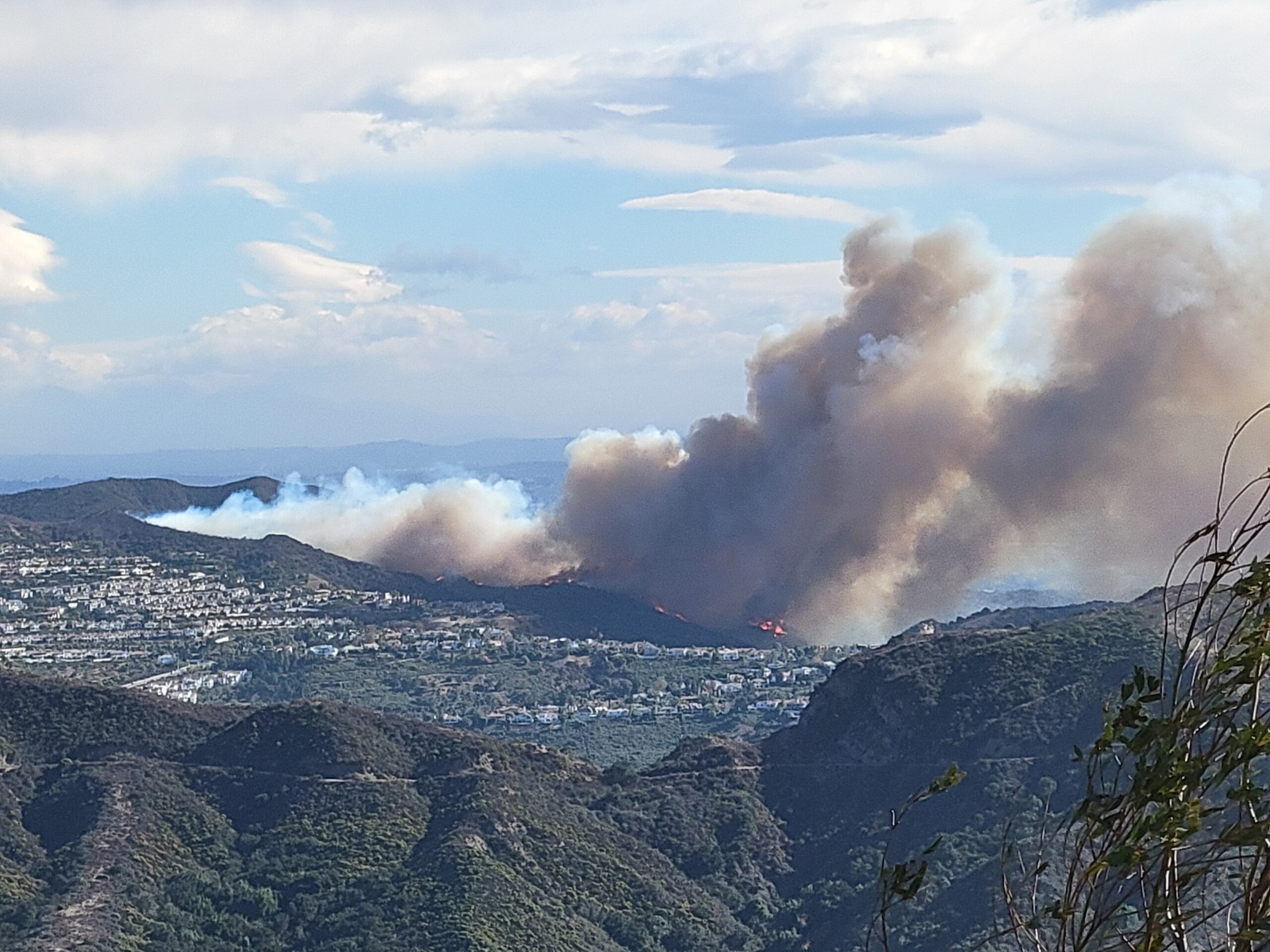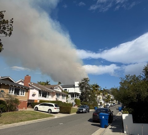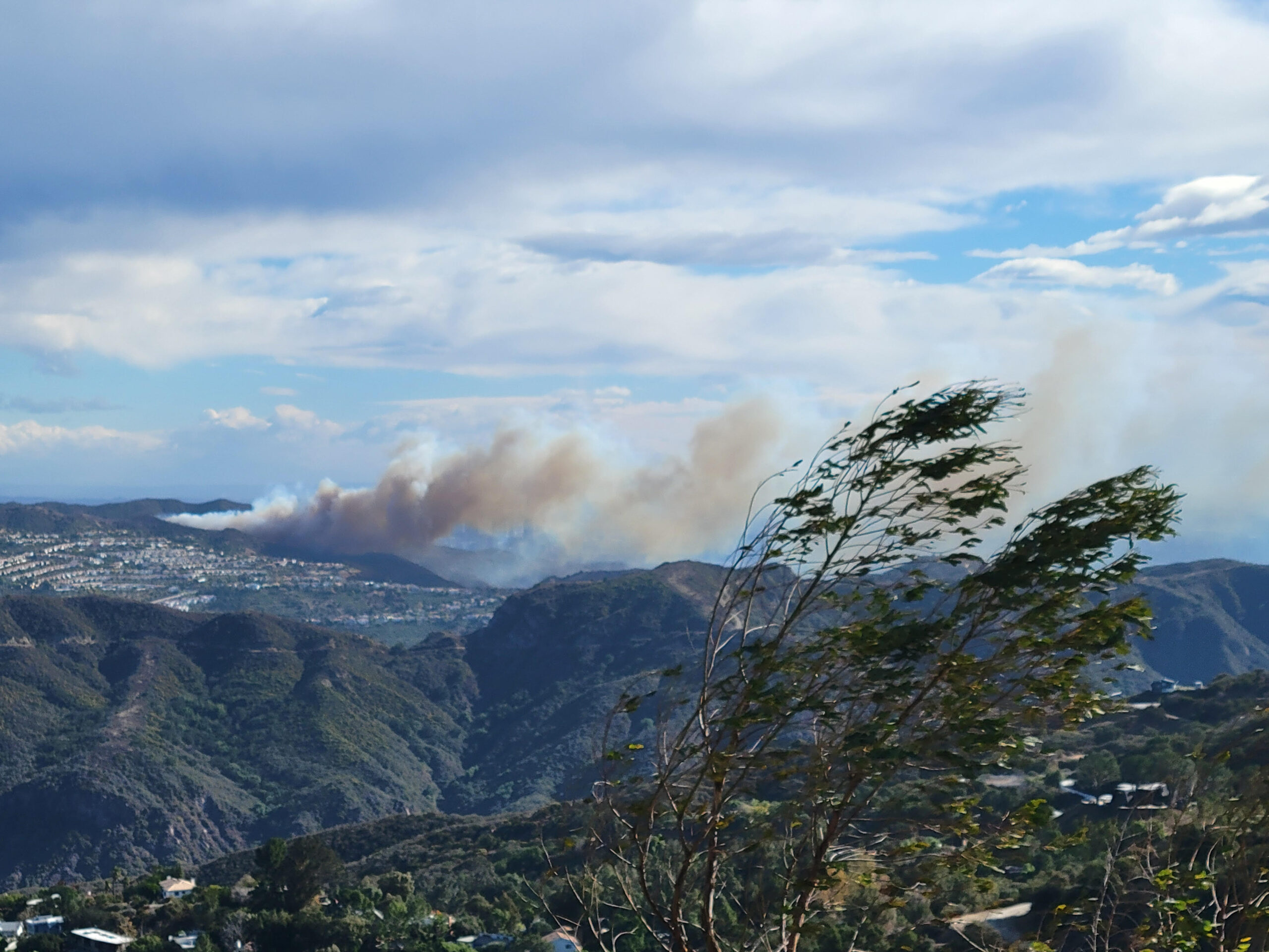 A person living in Topanga, who has the Watch Duty app, (City and County text alerts don’t work in that area) was alerted at 10:33 a.m. to a fire southeast of Palisades Drive and Calle Victoria. She went to her window and took this photo (below) at 10:38 a.m.