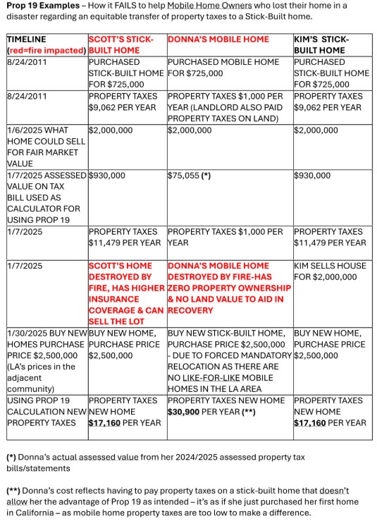 In addition to the high costs of buying in Los Angeles, working against us is a cruel quirk in Prop 19.  I’ve attached a chart illustrating the inequities for Mobile Homes vs Stick-Built homes destroyed in the fire and Stick-Built not destroyed in the fire.