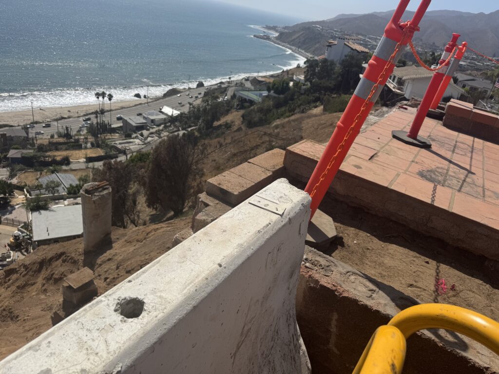 The house was built on caissons on a steep slope and there was a concern debris would tumble down the hill, so contractors put up a triple layer of highway barriers below. It took several months to remove the three homes on the slope.