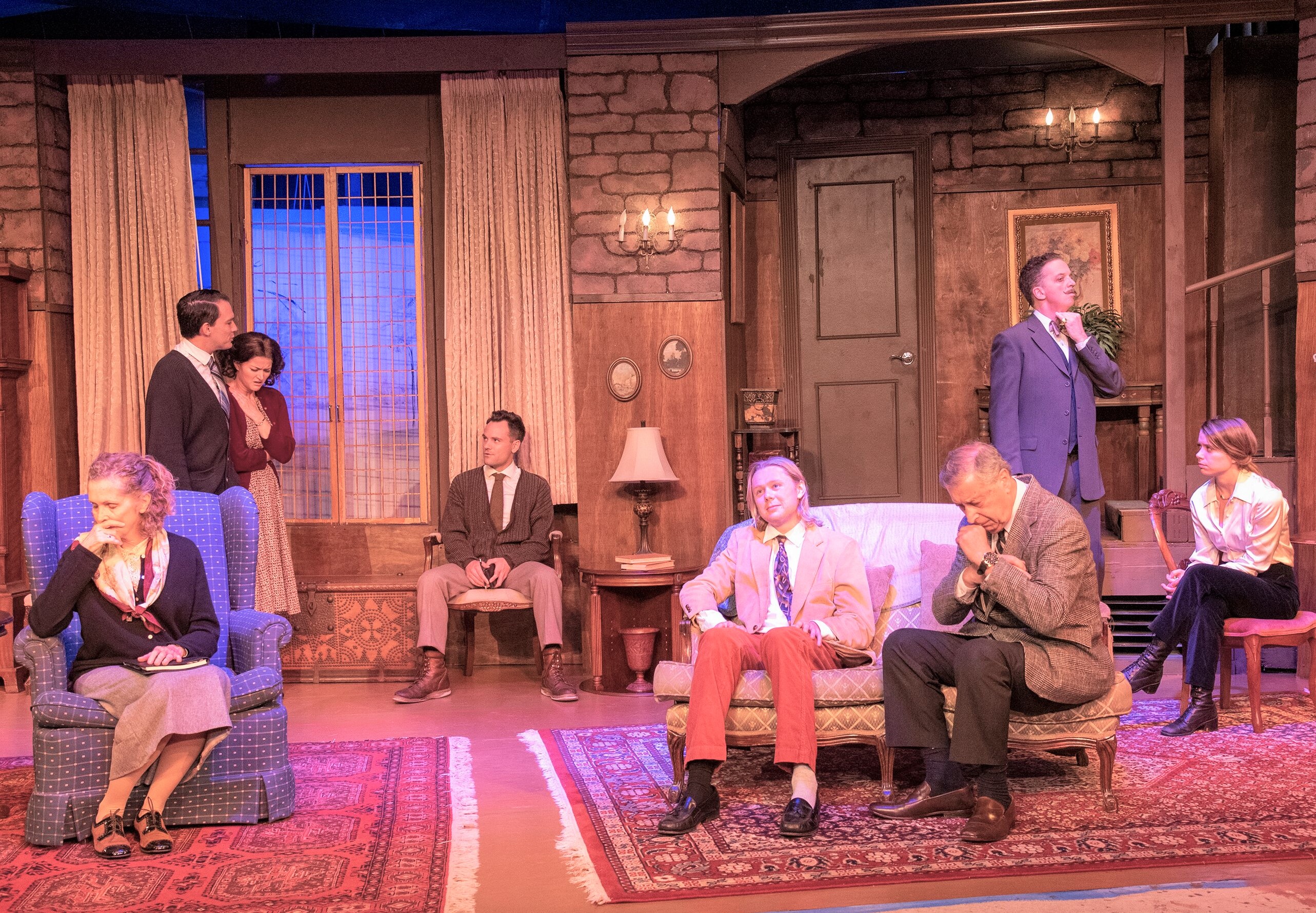 Members of the Theatre Palisades production of “The Mousetrap” include (left to right) Peggy Flood, Carl Meyer-Curtis, Grace O’Neill, Michael Coleman, Benjamin Orf, Michael Bernstein, Mark Fields Davidson and Antonia Czinger. Photo: Joy Daunis