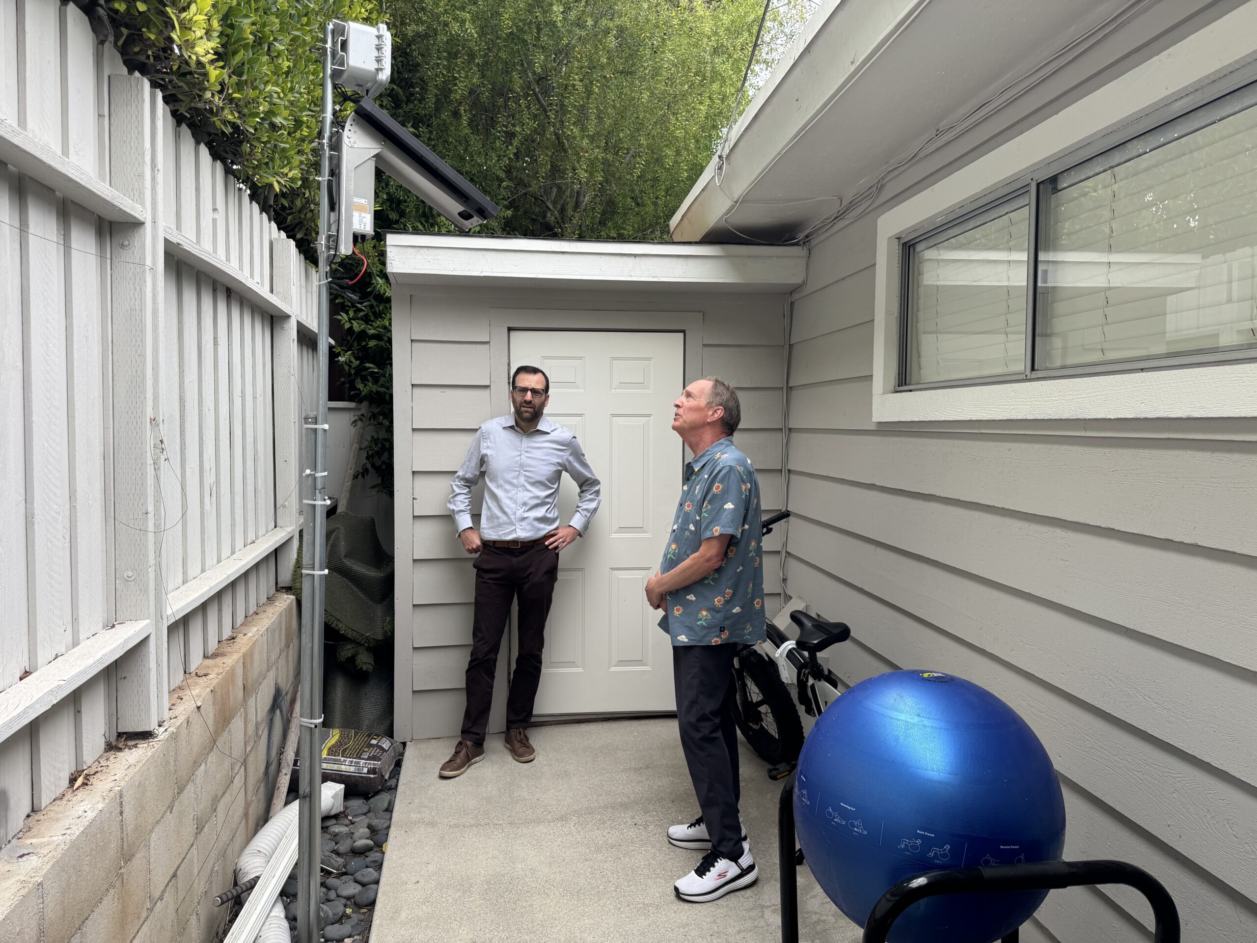 Larry Newman (right) shows Senator Ben Allen the air sensor that was placed in his backyard on the El Medio Bluffs by UCLA.