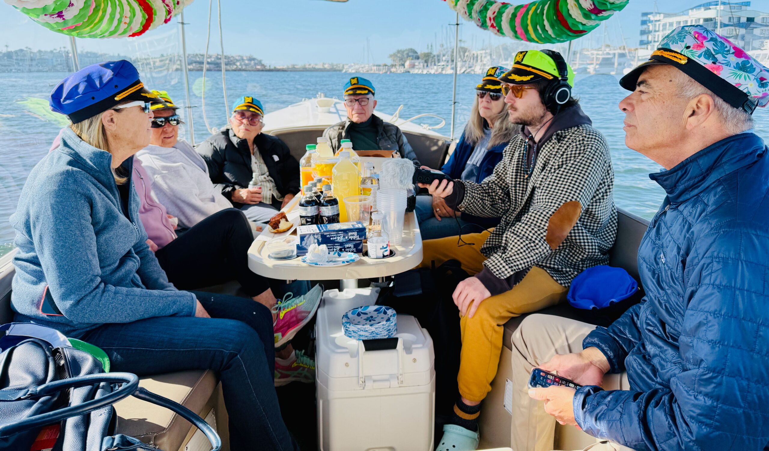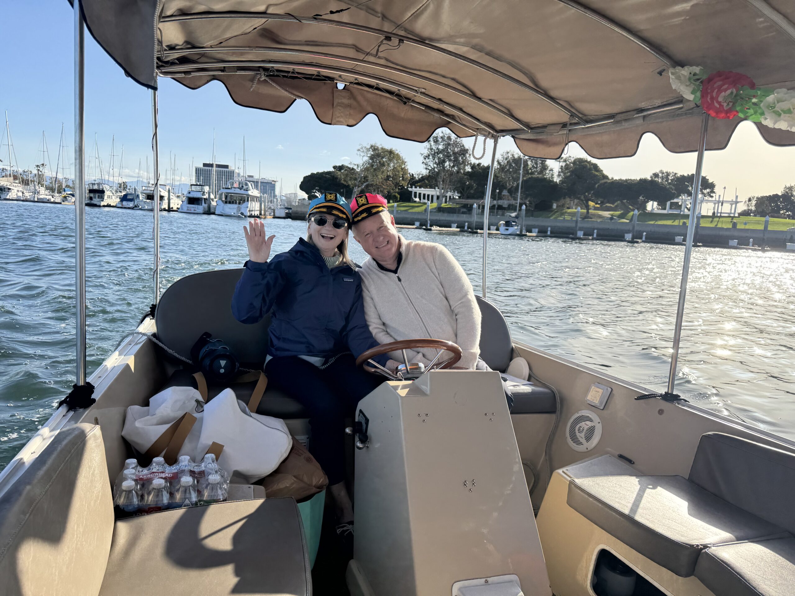 He told people that “ We’ll cruise around the marina at a whopping 7 MPH and wave to the ducks, turtles and seals—and solve all of life’s problems.  Or most of them.”