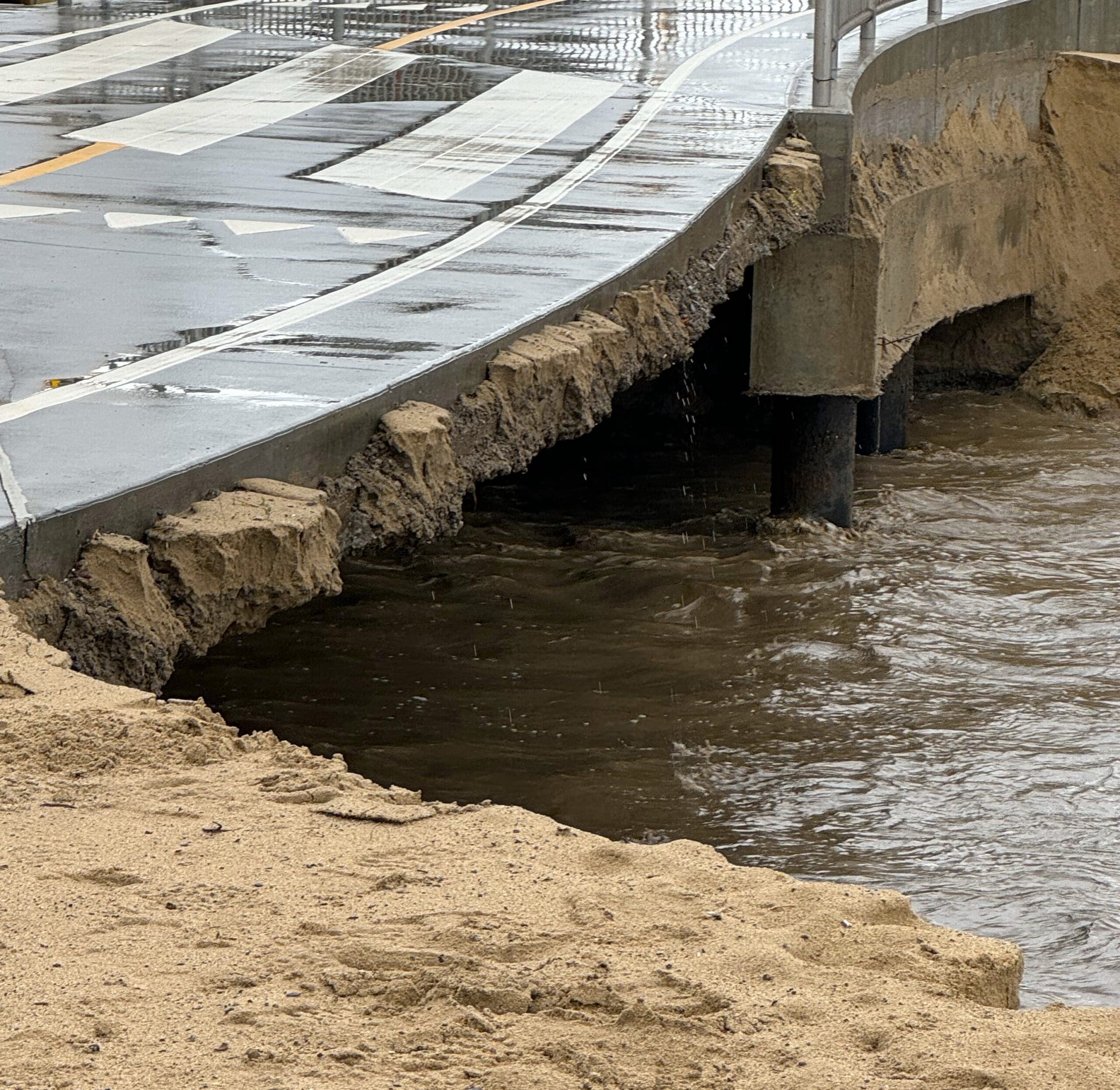 There was damage done to the beach path at Chautauqua and Channel Road, at the site were flood channels flow into the ocean. The Marvin Braude Beach Bike Path, which was dedicated in May 2023, was closed because the sand under the concrete-slab bridge, washed out, leaving no support.