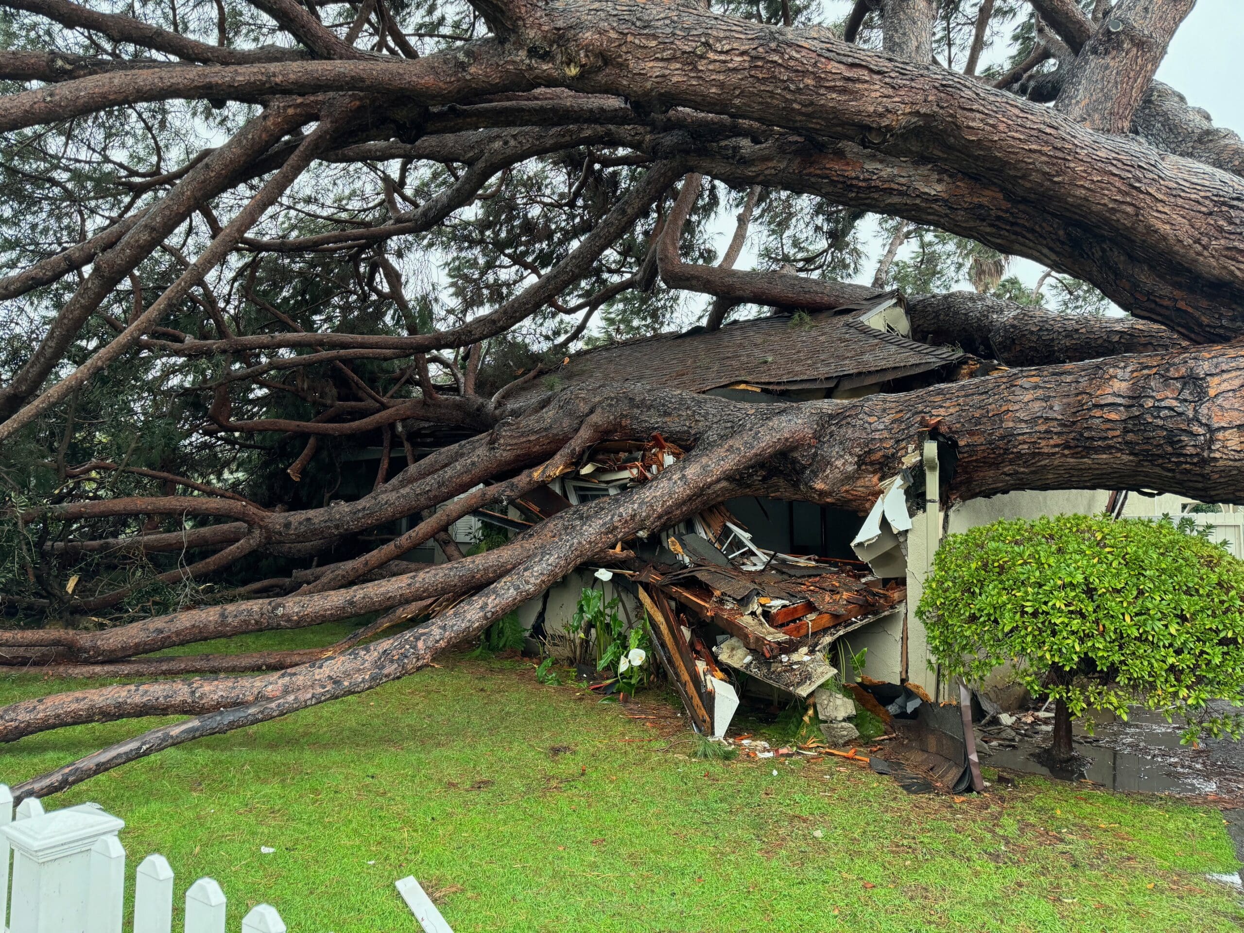 Outside, a large pine tree fell on the Convent home on at the corner of Toyopa and Alma Real, causing major structural damage. No one was in the house, when the tree fell.