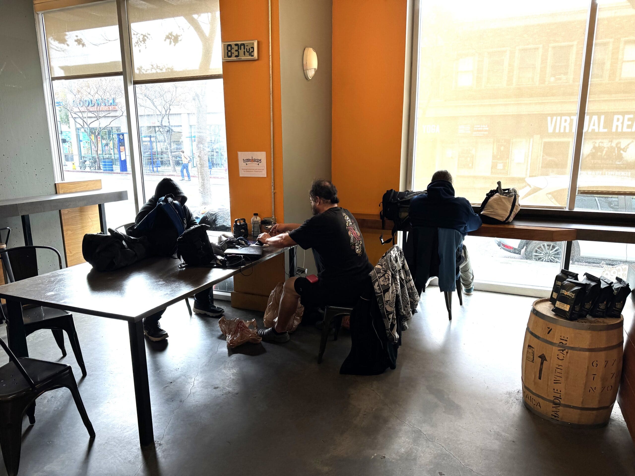 There were four homeless men (one is unseen in another corner) in a coffee shop in Santa Monica. The shop is closing. The official word is it is closing because “the lease is up.” Unofficially and off the record, there have been too many incidents with the homeless.