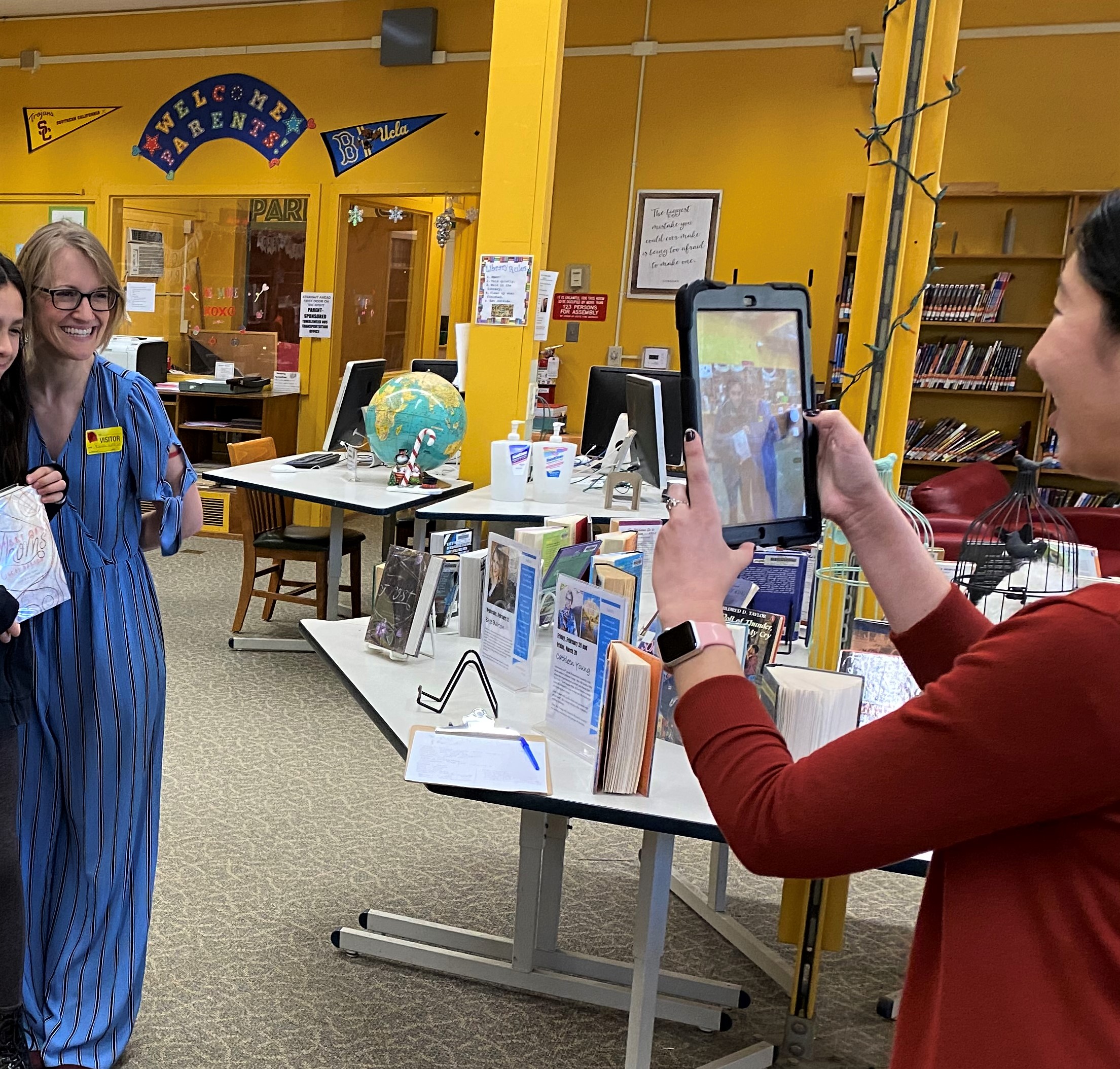 Paul Revere librarian Gabriela tk, takes a photo of author Bree Barton and a student in the Revere library.