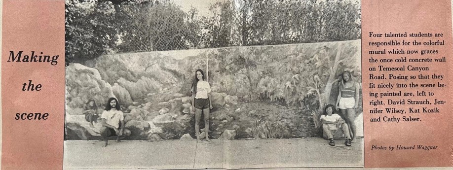 In 1983, two Palisades High School students Kat Kozik and David Strauch received permission from the City of Los Angeles to paint a mural of the evolving history of Pacific Palisades, starting with its first people. Fellow students Cathy Salser and Jennifer Wilsey joined them.