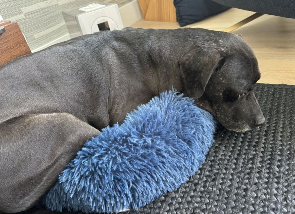Benny, in his first night out of the shelter, tries to curl up in a bed meant for a much smaller dog.