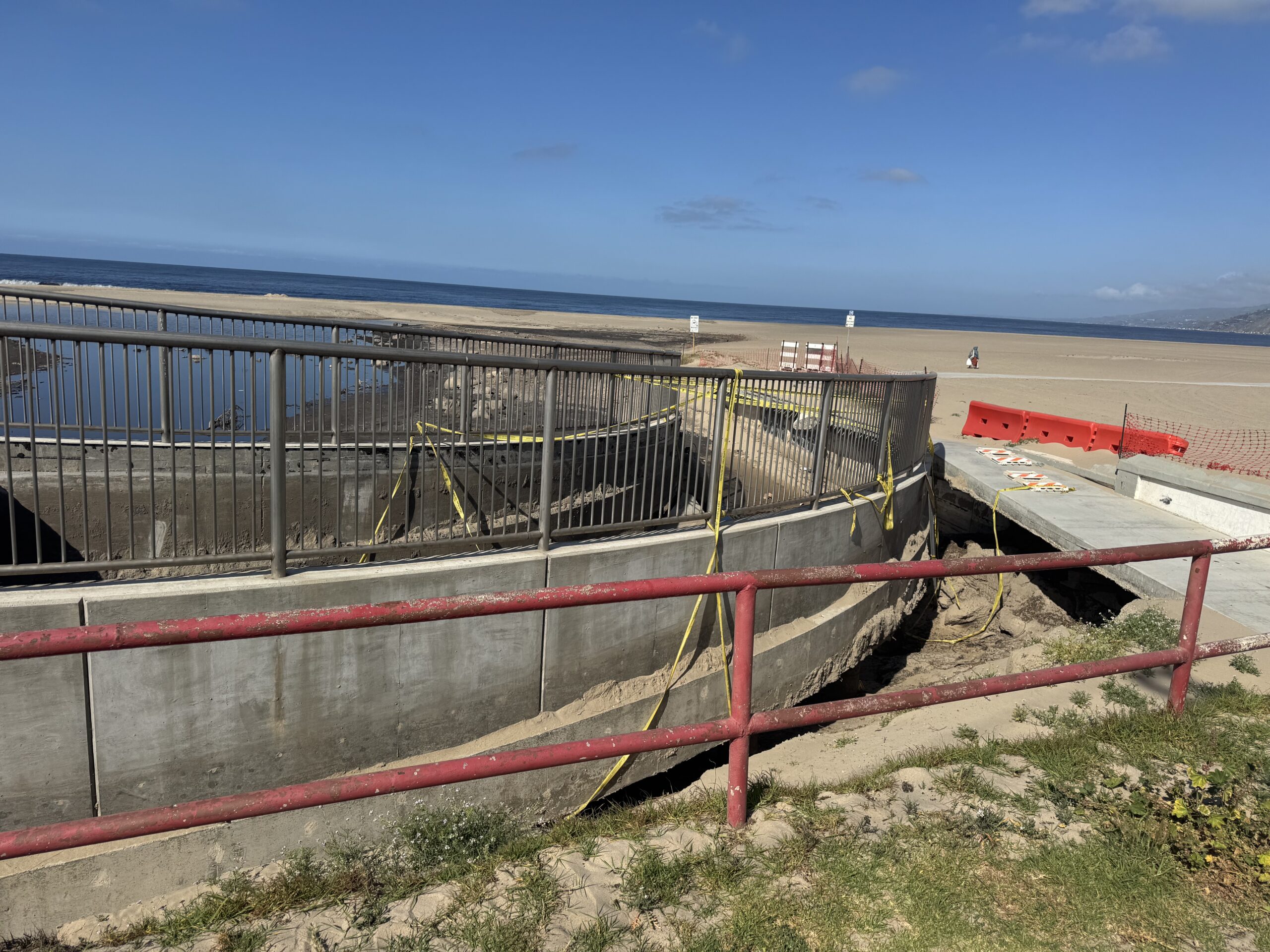 The $6 million bike path bridge “fell into the ocean” in February 2024, and may now be repaired with FEMA funds, according to Kerjon Lee, chief communications director for Los Angeles Public Works. This two-year-old concrete slab bridge was located on the beach across from Entrada and Chautauqua.