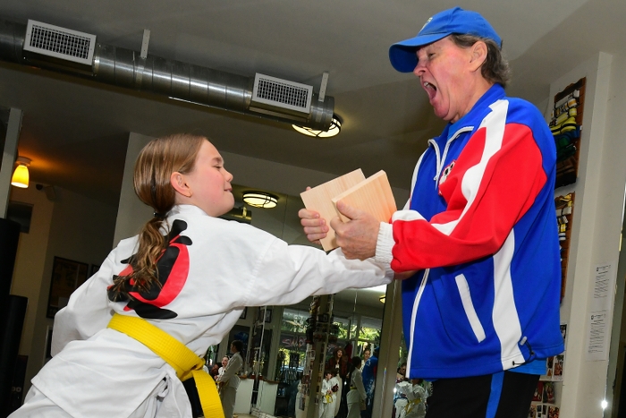 Gerry Blanck held a wooden plank for a student, who punched it in half during the festivities at his 42nd celebration party.