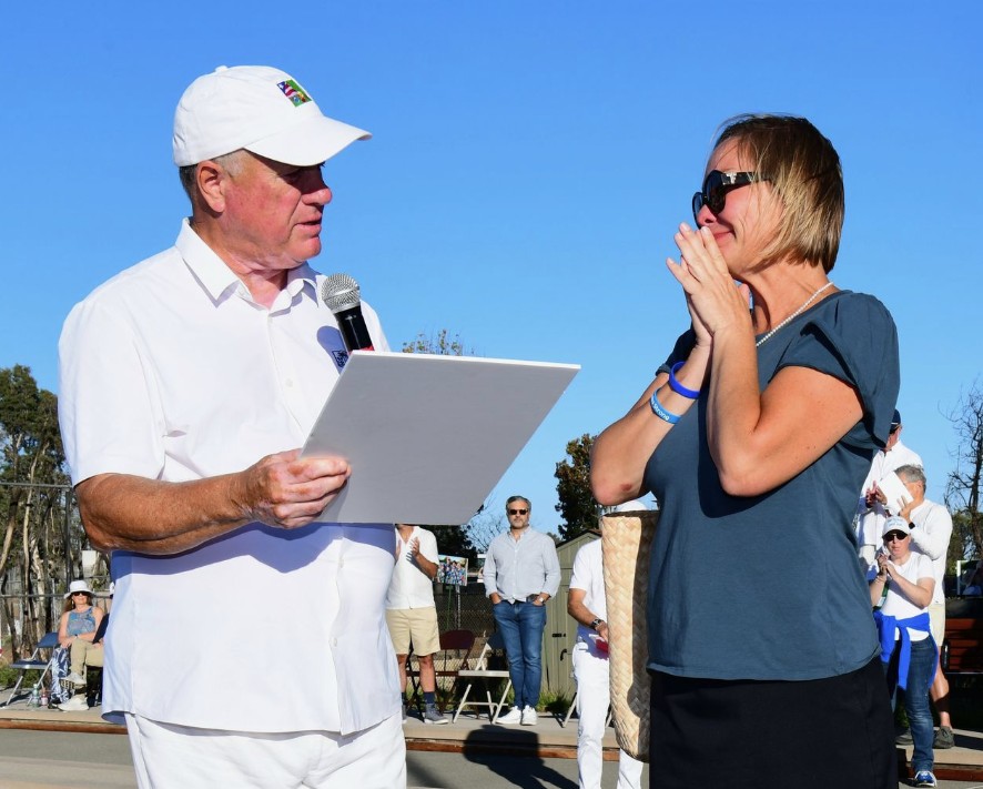 Councilmember Traci Park was overcome with emotion when Jimmy Dunne presented her with the “Phoenix of the Palisades” award.
