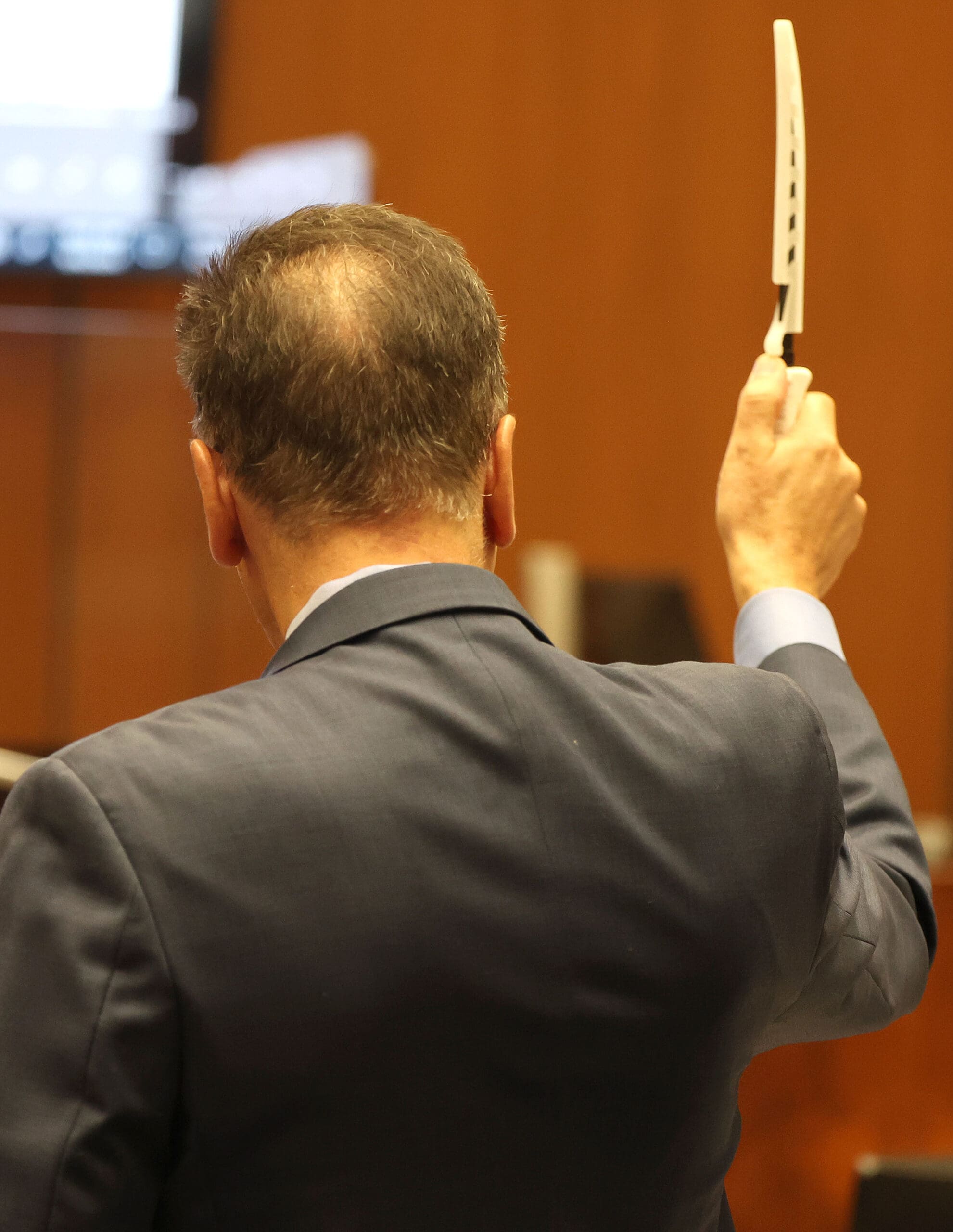 Los Angeles Deputy District Attorney holds up a replica of the murder weapon that killed of UCLA college student Brianna Kupfer. The events leading up to the murder had been recorded and was played in court. The victim could be heard pleading for her life during the audio.