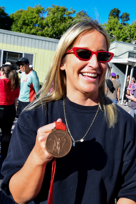 Swimmer Kimberly Vandenberg showed students her bronze medal.