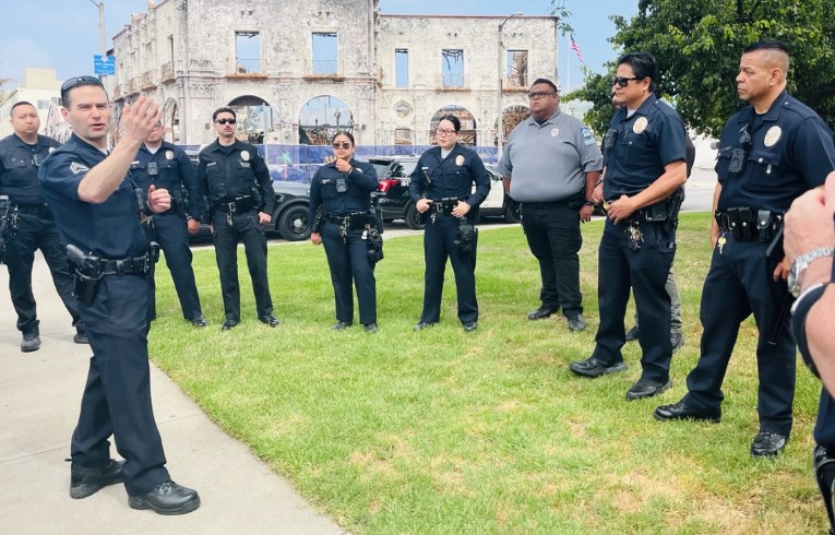 LAPD, including LAPD Police Chief Jim McDonnell (third from left), attended Councilmember Park’s news conference introducing cameras. The department is currently short of personnel.