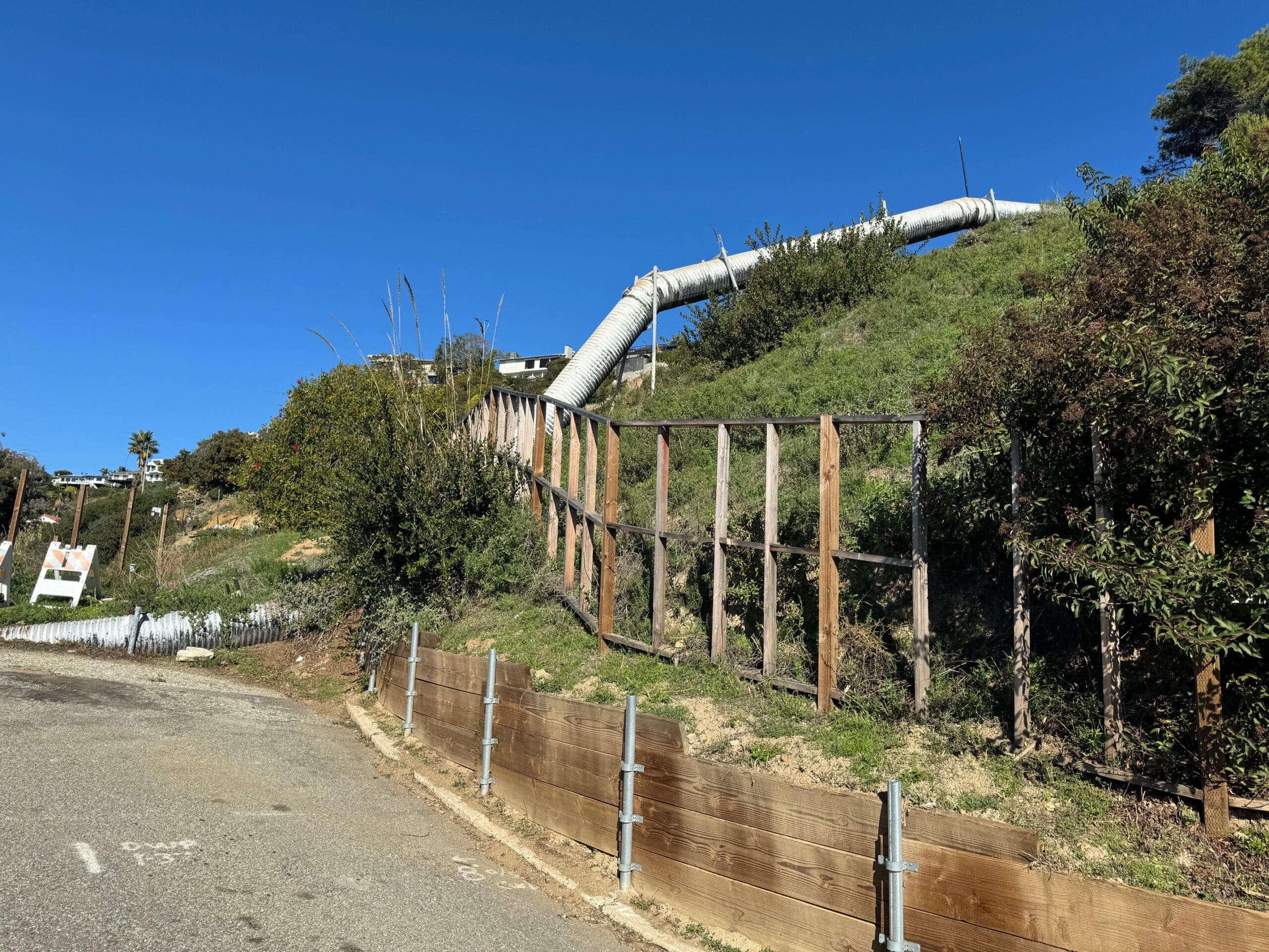 This drainage pipe, which is overgrown with foliage is meant to capture water and prevent it from going onto the active Revello slide, which is directly below the 12’4″ road.
