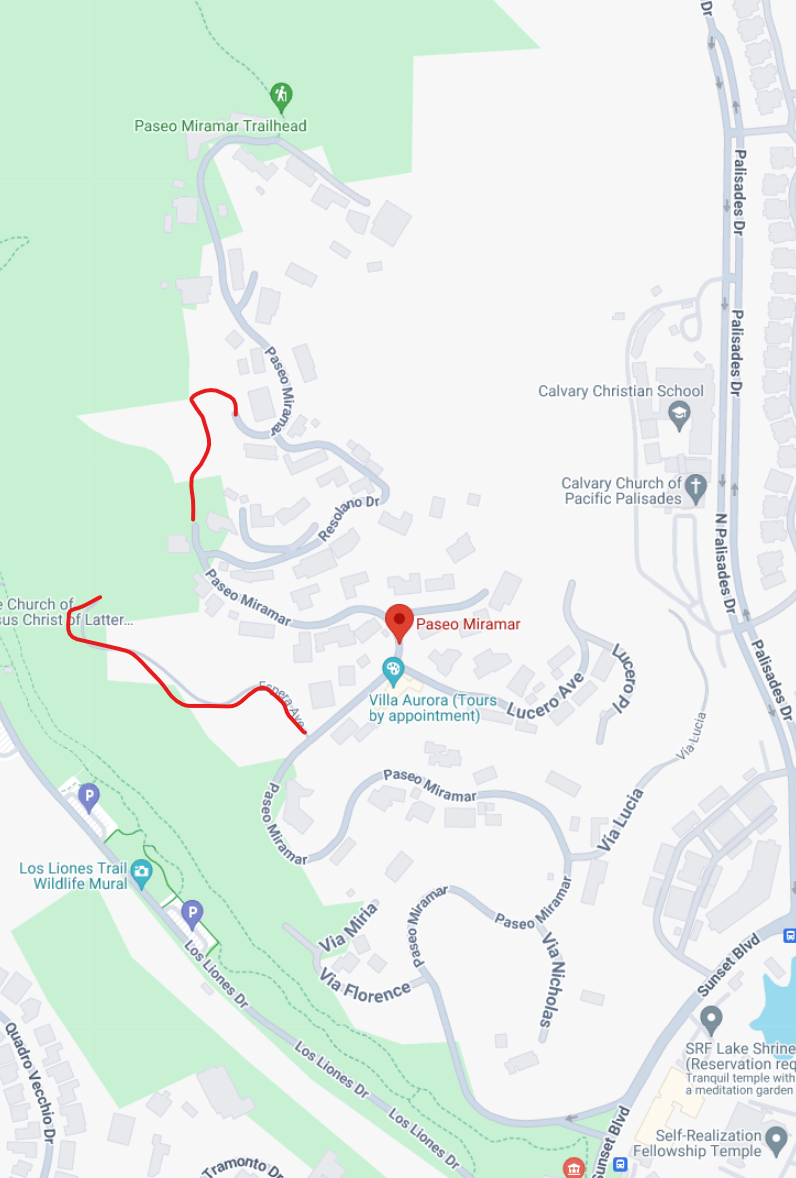 The street of Paseo Miramar starts at Sunset Boulevard and winds its way to Topanga State Park. In 1941 a slide removed part of the upper street. Traffic to upper homes had to be rerouted via Resolano Drive in 1944, after the City acquired portions of three lots, via eminent domain.