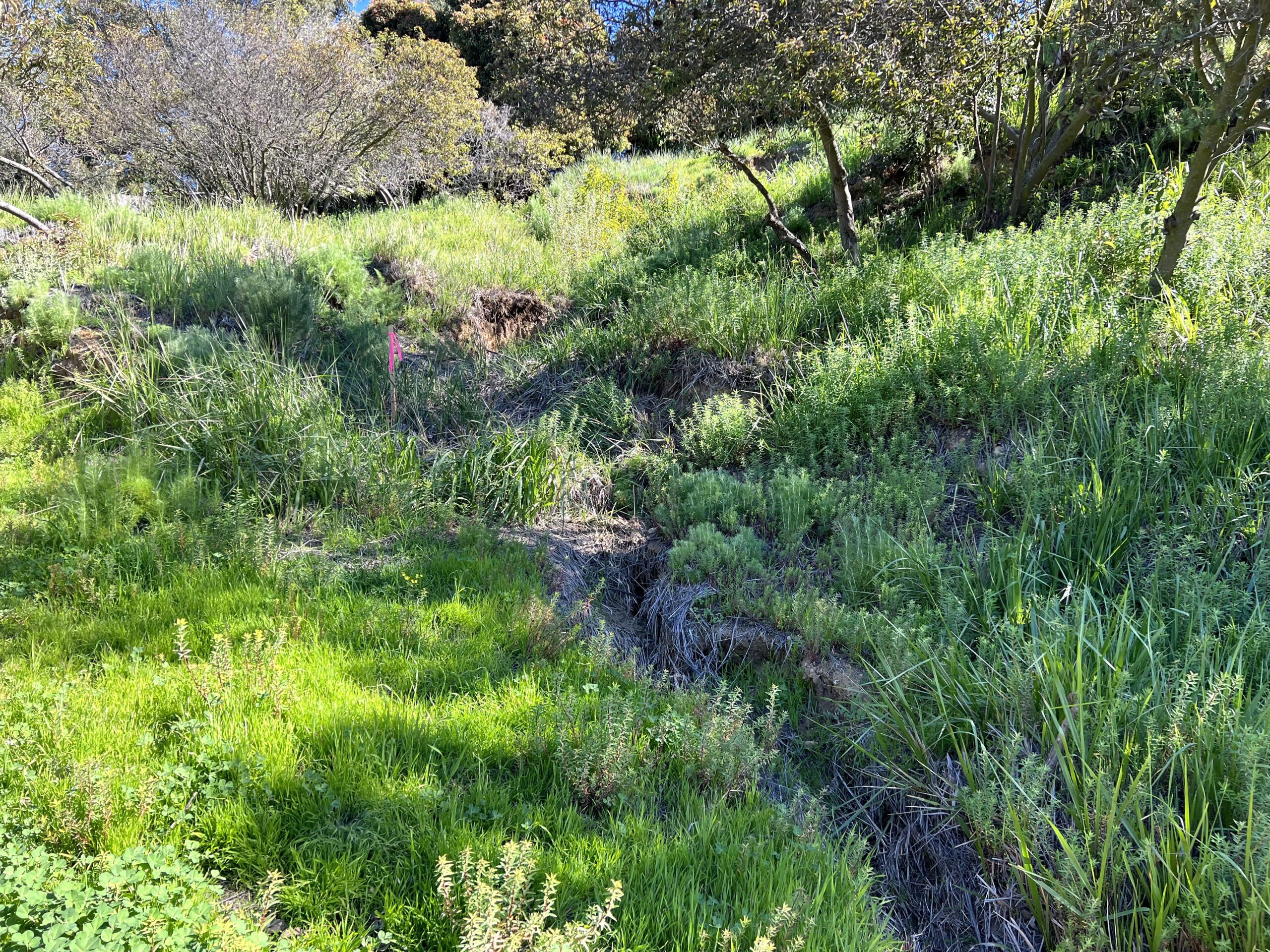 One geological expert seemed to think that a portion of the road might have gone over the hill with the landslide. There is still a sewer tunnel/cover, which was probably in the middle of the road, but is now surrounded by brush. Further up where the road is relatively intact there are still manhole covers.