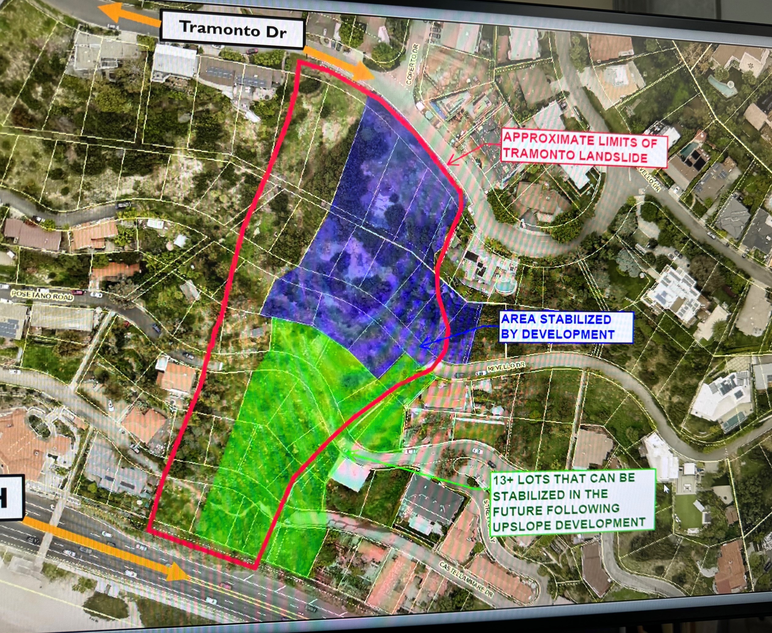 The Tramonto landslide is outlined in red. The developers own the “purple” properties and the construction they propose would only deal with that portion of the landslide. The lots in green would need to be stabilized by further developers because the City says it does not have the money. At the bottom of the diagram is Pacific Coast Highway.