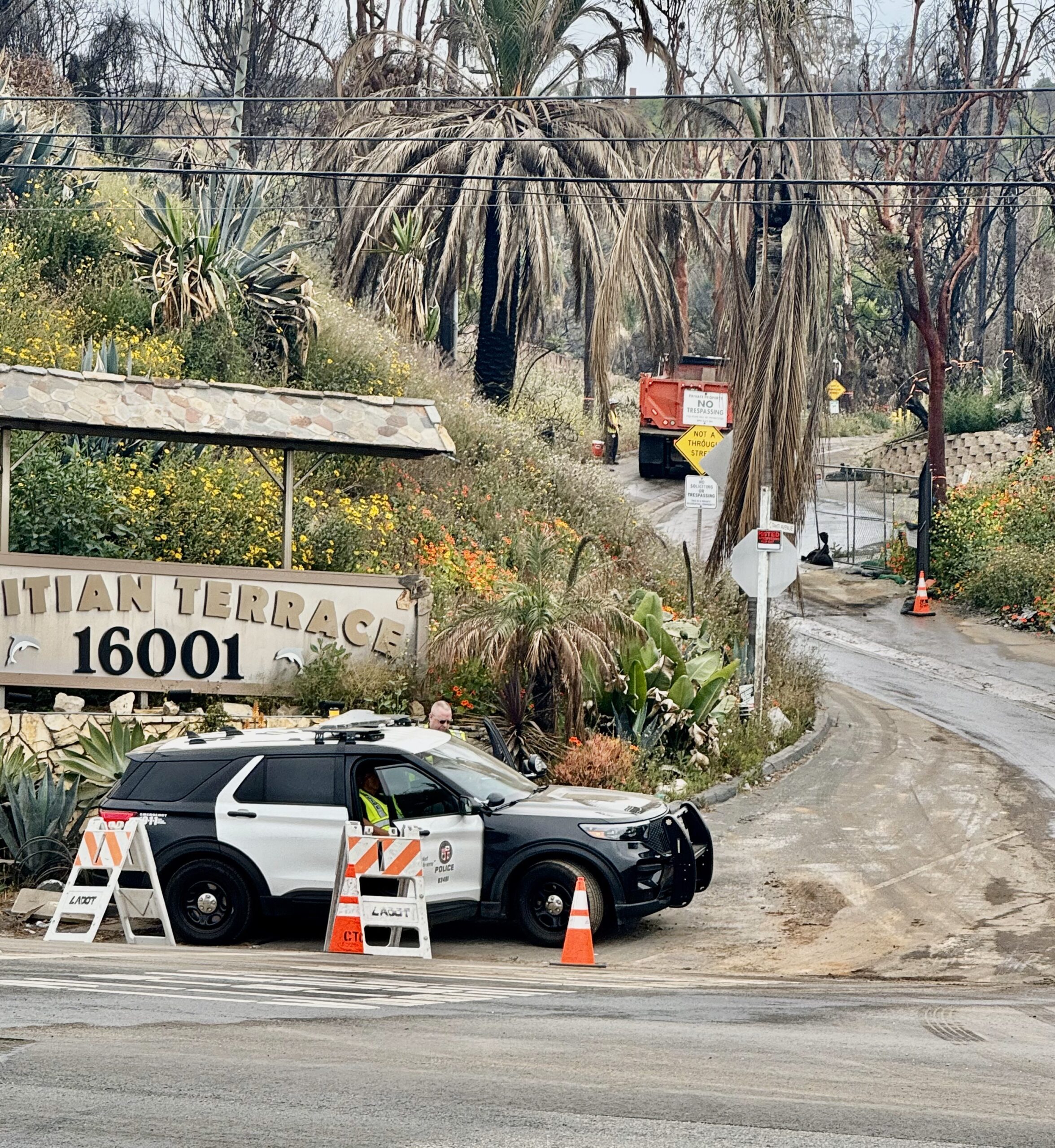 Police cars were stationed at different roads off Pacific Coast Highway, such as Tahitian Terrace to prevent unauthorized access to Pacific Palisades.