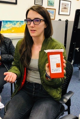 Newark said Common Ground provides needle cleanup in addition to distributing sterile needles and associated supplies to drug users to reduce the spread of diseases through sharing needles. Because some of the PPTFH volunteers and workers find used needles at times, Newark demonstrated the proper way to dispose of them.