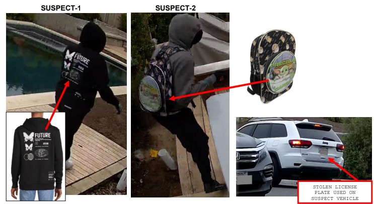 Suspect 2 was described as male, thin build, 20-30 years of age, wearing a gray hoodie, black facemask, gloves, pants and shoes, and a Star Wars “Grogu” backpack.