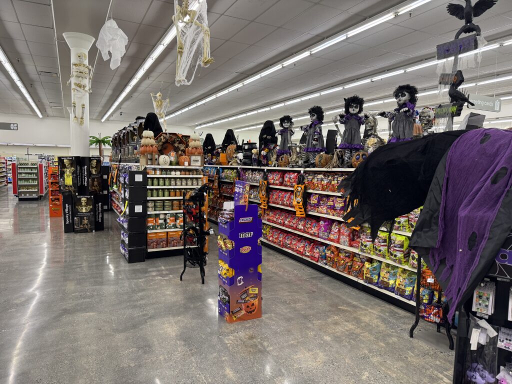 The grocery store area has been expanded a bit, and it is possible to buy some staples, such as rice, pasta, flour and sugar, which is important since there is no grocery store currently operating in the village.  Already, looking to the future, Halloween items are on the shelves.  Check out has been reconfigured, but the four self-checkout islands are still available.
