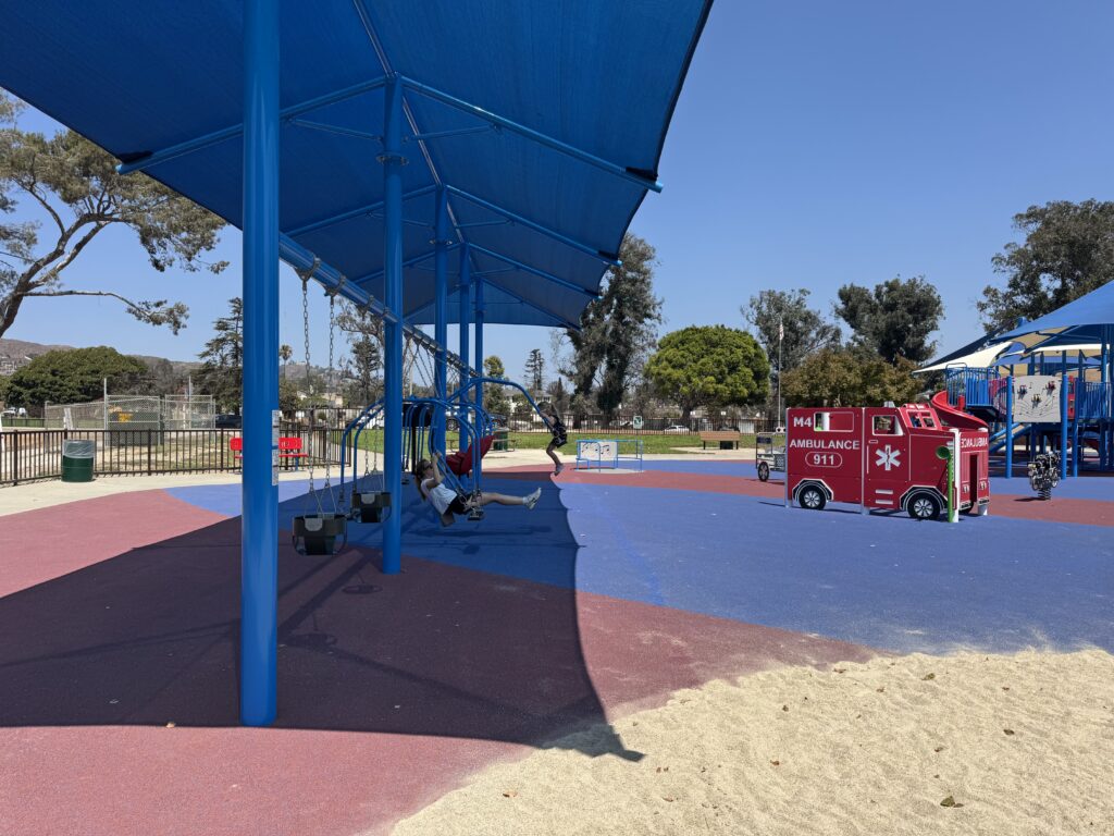 The playground surprisingly had several kids playing and the exercise space behind it, which had been redone, had several children playing there.
