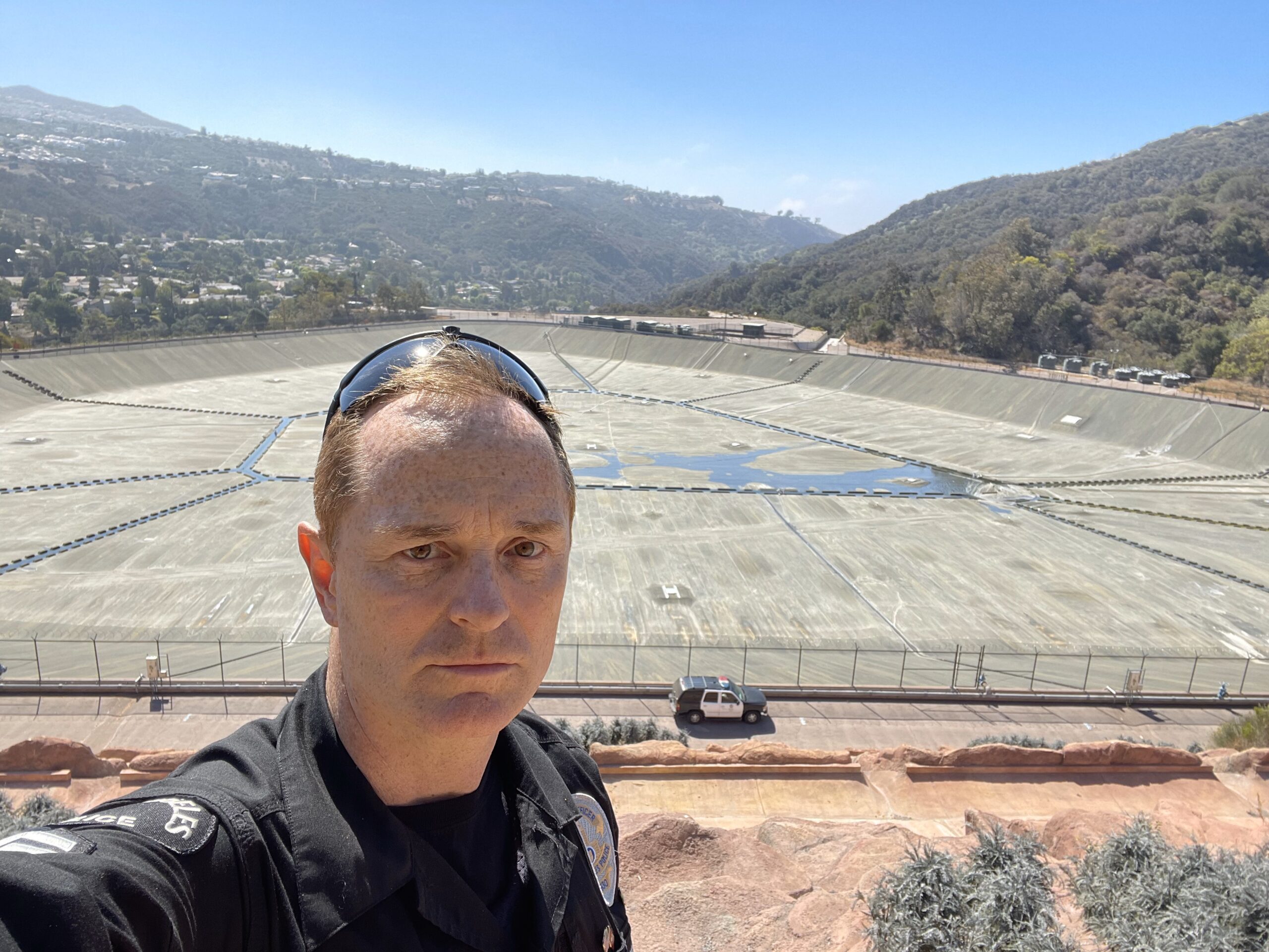 Former LAPD Beach Patrol Officer Rusty Redican routinely patrolled areas in the hills, such as by the Santa Ynez Reservoir. This photo of the empty reservoir was taken on July 5, 2021.