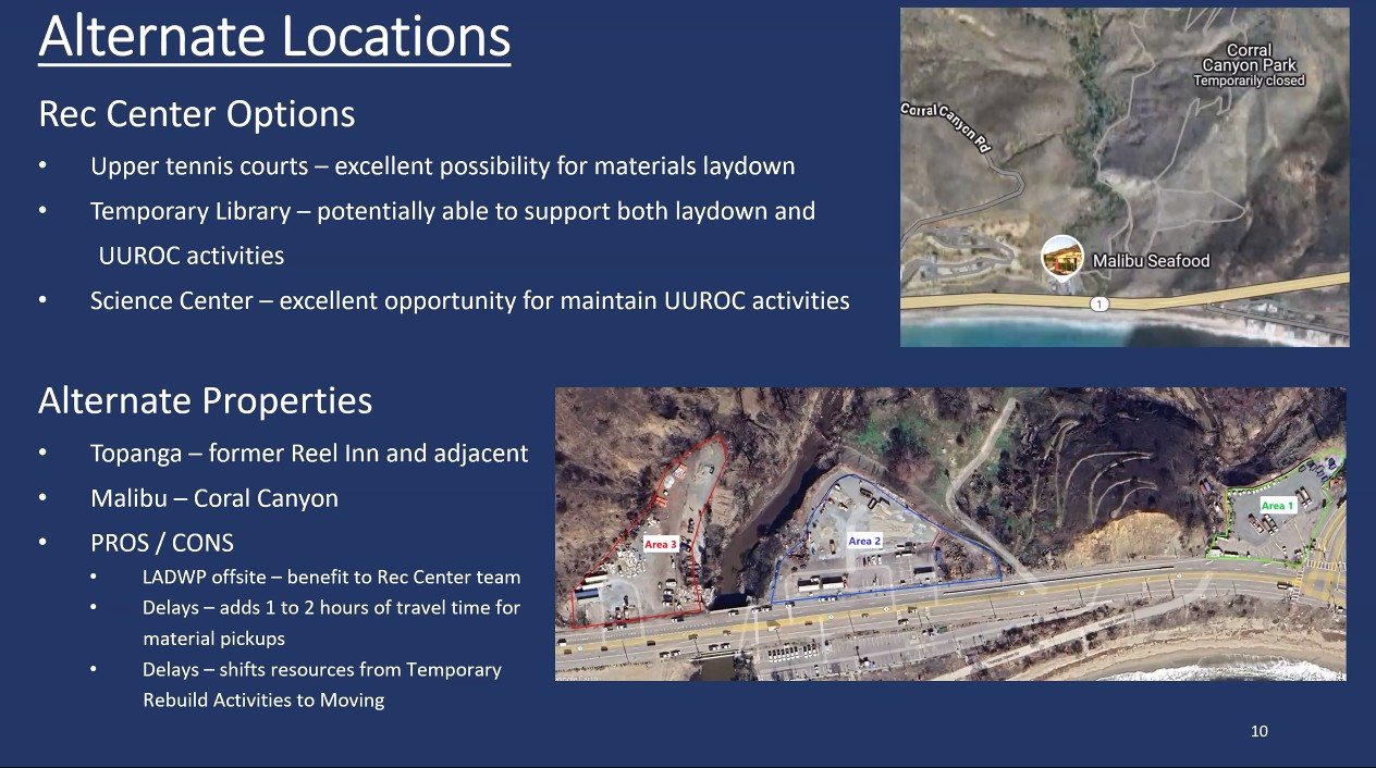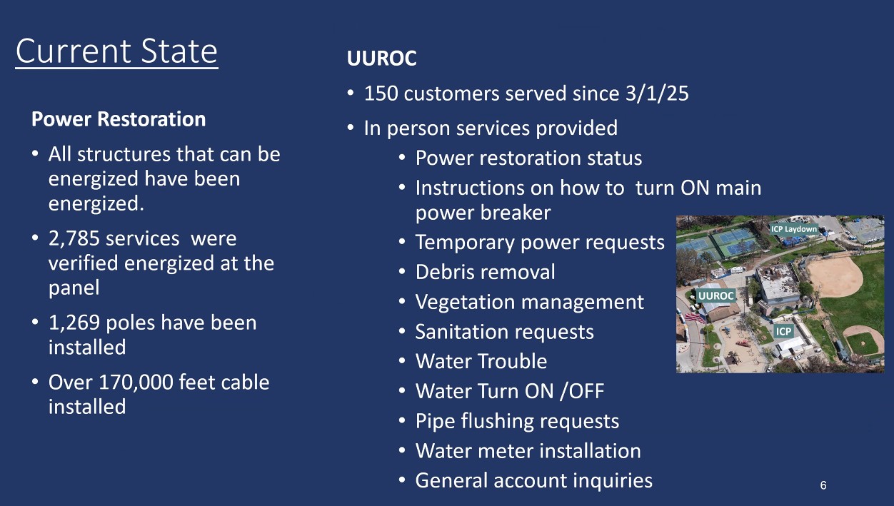 Immediately after the Palisades Fire on January 7, DWP took over the Rec Center. They used the standing old gym as a UUROC (Unified Utilities Rebuild Operations Center). It was supposed to be a center where customers and contractors could talk directly with LADWP. Numerous tables and chairs were set up through the small gym with dividers, but when CTN stopped in, there were only three people in the small gym.