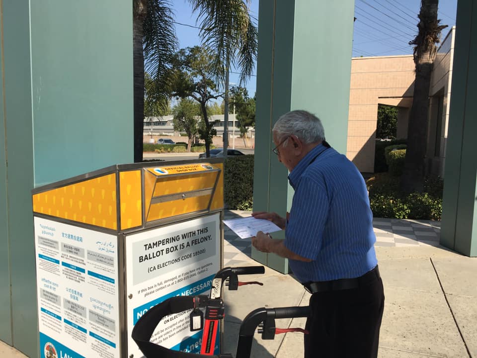 Despite the risks associated with being 96 years old during a pandemic, Ernest Marquez wanted to vote in person. The compromise was the official drop box at the library [Woodland Hills] where he could see the camera focused on the box. And yes, he made his choices on every single item. Democracy in action.