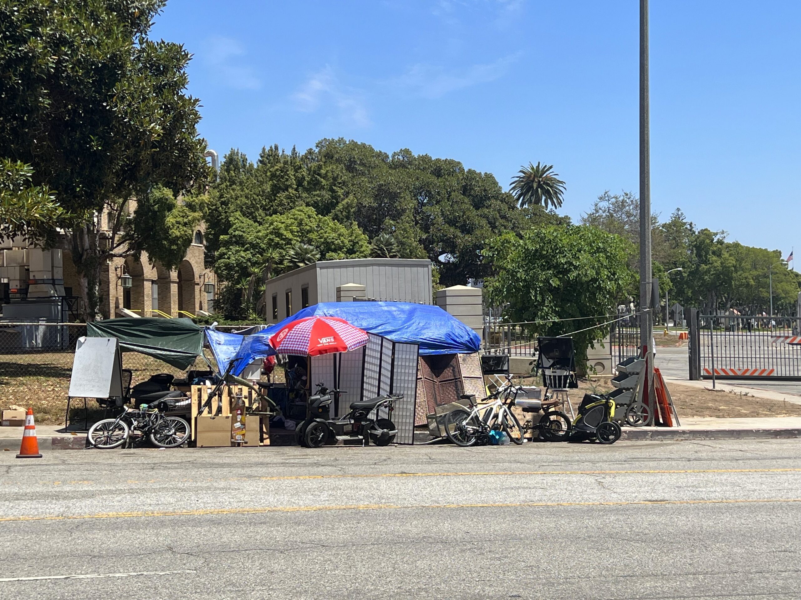 Homeless have started to take over the sidewalk by the entrance to the west gate at the Veteran’s Administration in Brentwood.