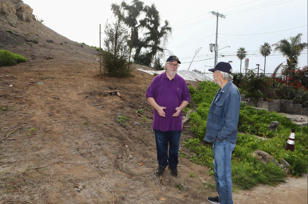 Rotary club members David Card (left) and Perry Akins discuss new plantings to replace landscaping destroyed in the Palisades Fire.