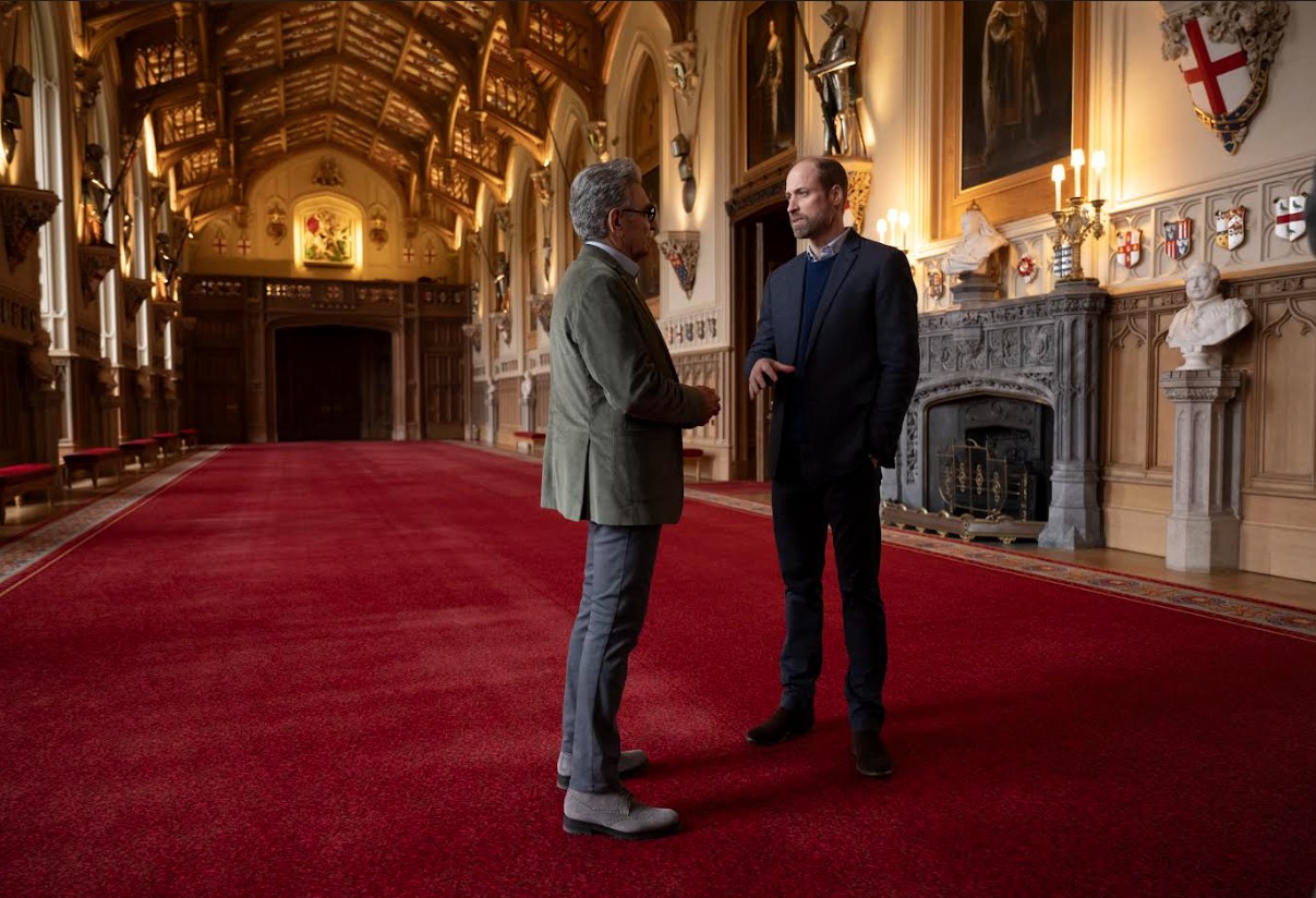 Eugene Levy and Prince William chat inside Windsor Castle.