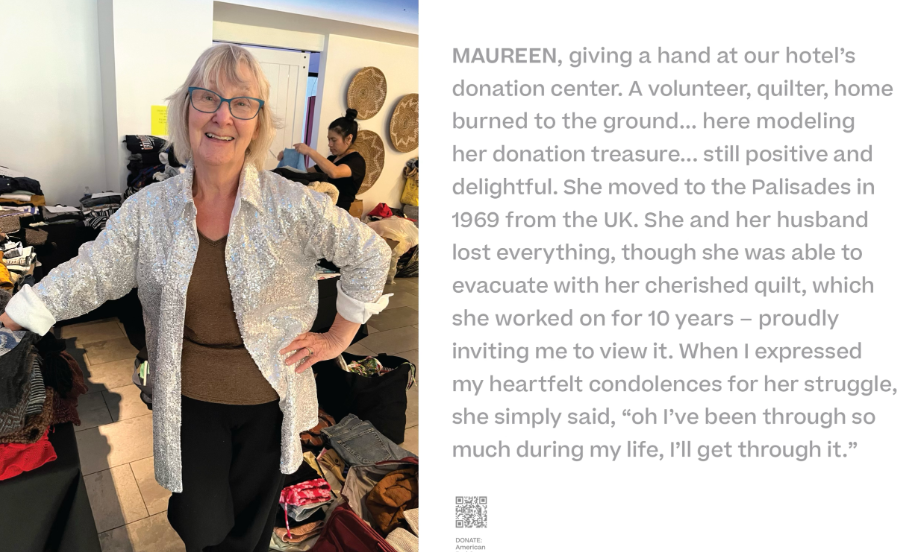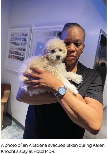 In spite of the stress and tragedy of the fire, she found that her 176 days at the Hotel MDR offered gifts. She befriended a potpourri of women, including a hotel cleaning lady and a struggling Altadena resident who adopted a small dog for comfort. Using her phone, Knecht took spontaneous photos of her new friends and acquaintances and later wrote vignettes about them that have become the heart of her upcoming exhibit at Gallery 169 (169 W. Channel Rd.)—You Are Here—Hotel MDR: 176 Days.