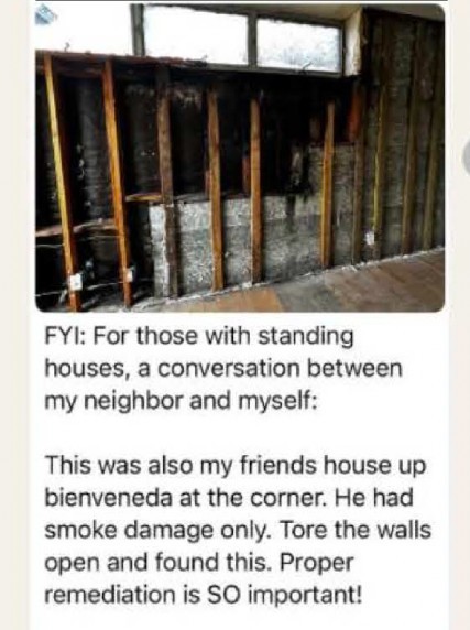 The actual owner tried to post the truth because this false story caused many homeowners to fear that burned wood could be inside their walls just because a house burned close by.