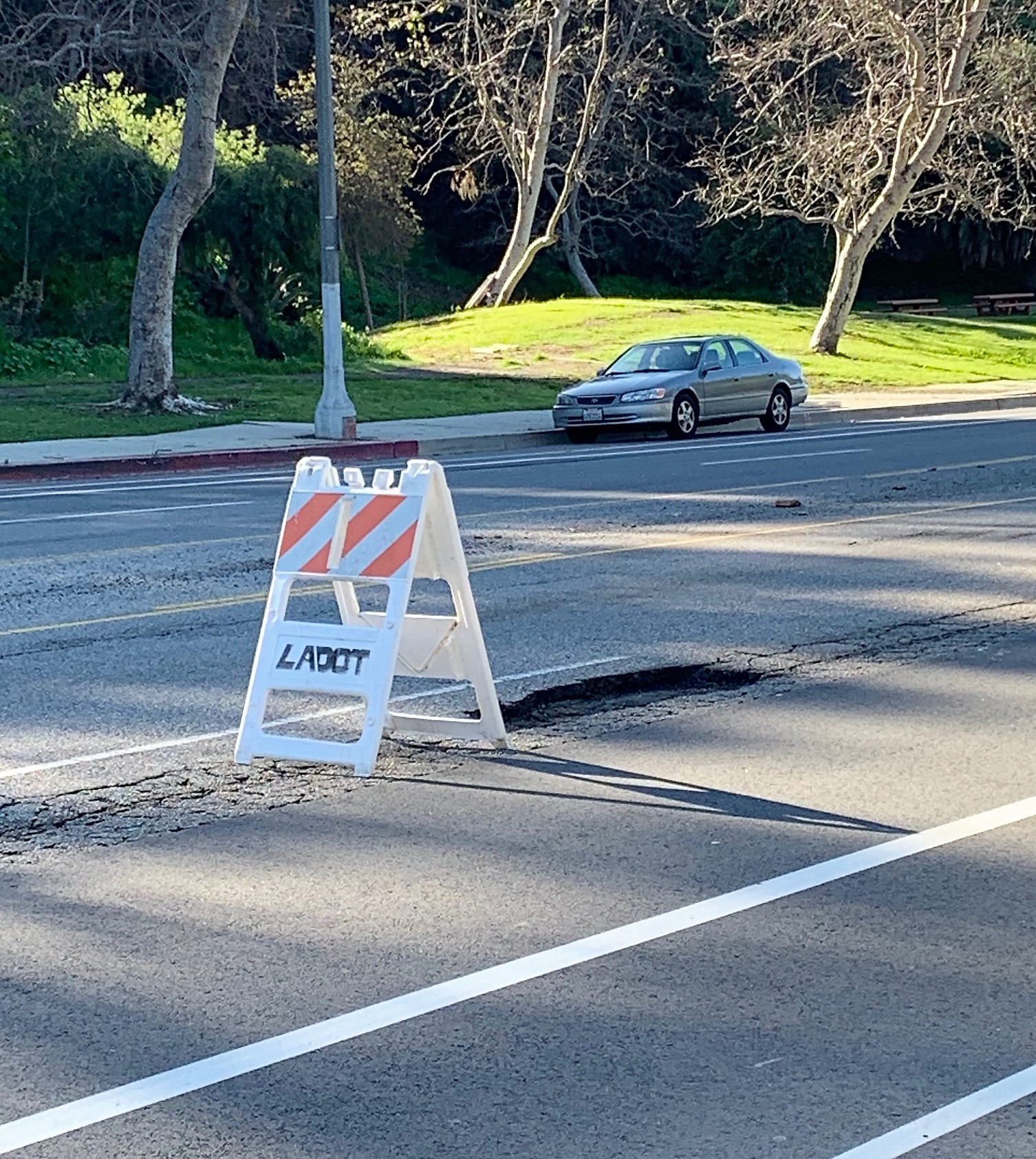 Just below the Palisades High stadium on Temescal Canyon Road (by the stacked wood) is a pothole that is about four feet long, by a foot wide, by five inches deep. It is in the slow lane. A small barrier to warn motorists had been placed in front of the hole, but someone had knocked it over by 8:30 a.m.