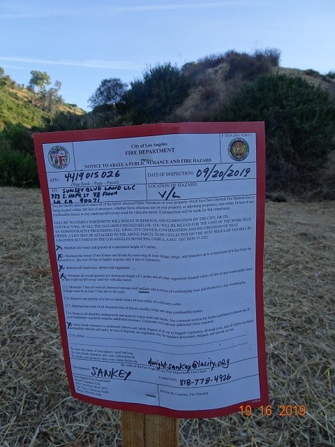 “This privately-owned property along Sunset just east of Palisades Drive has been tagged by you for brush clearance and is non-compliant.