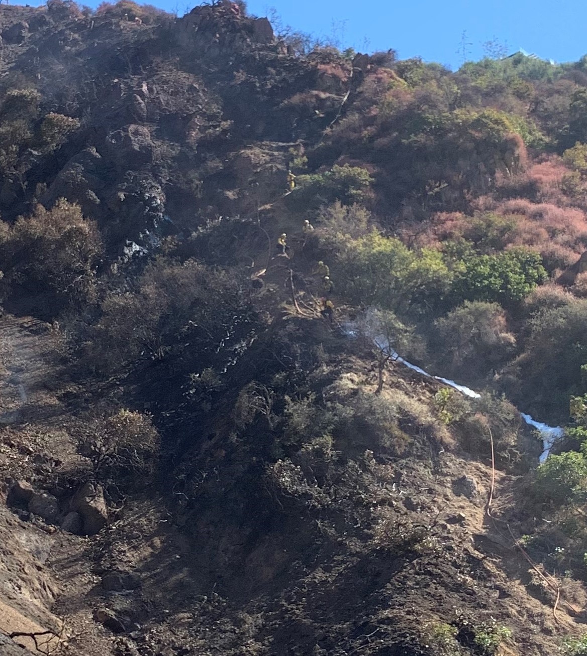 There were hose lines up the hillside, and Ochoa noted that the LAFD has leased two trucks (Type 3 Stripe team) from the State that can go off road, but also have the capacity to pump water. The hose from that truck goes up the hill and every 100 feet, a tap line is introduced that allows for additional hoses.