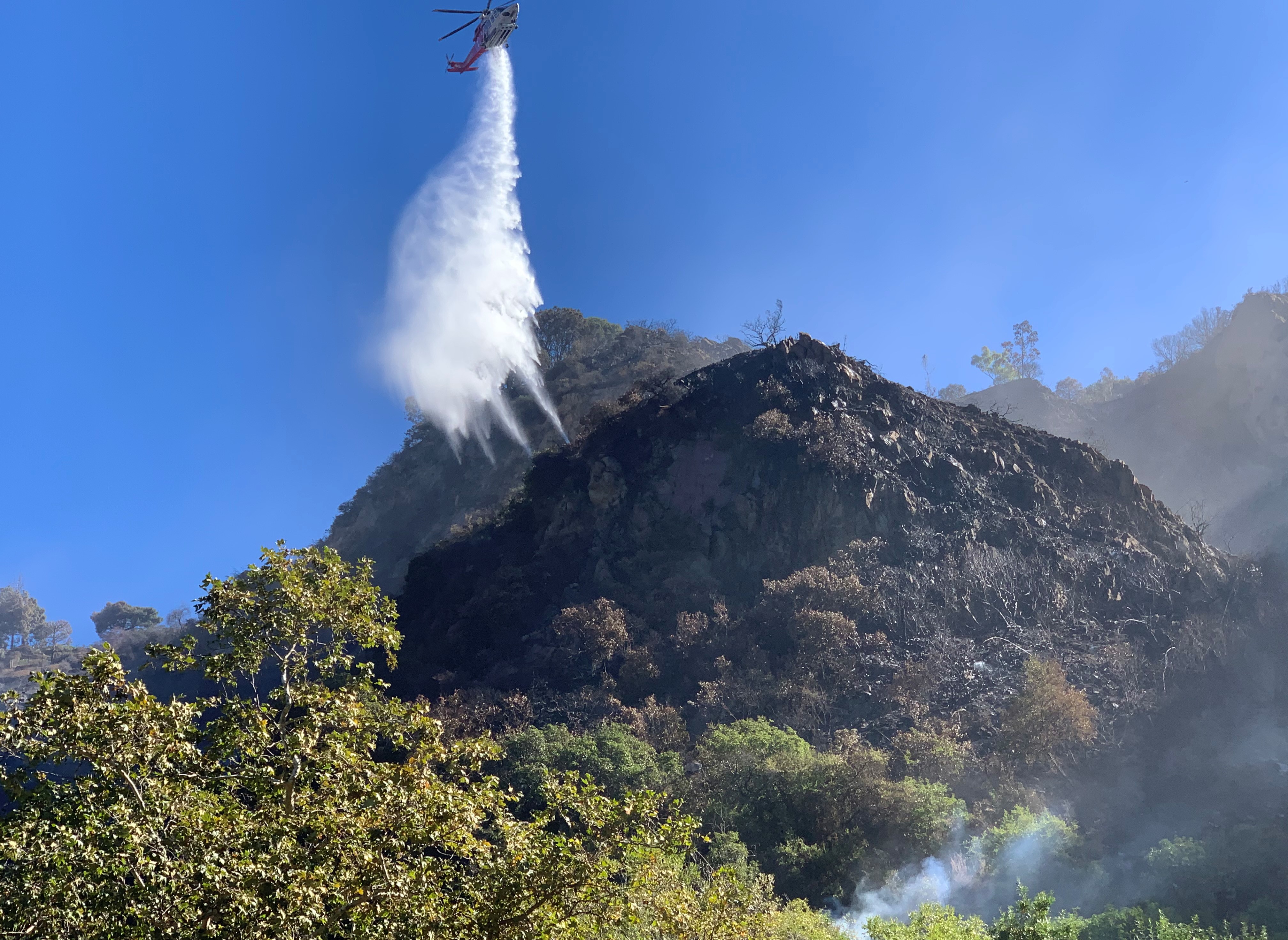 An LAFD water truck filled the state trucks after being filled from the Highlands reservoir. Helicopters continued to make water drops on areas where smoke plumes appeared, before returning to the reservoir.