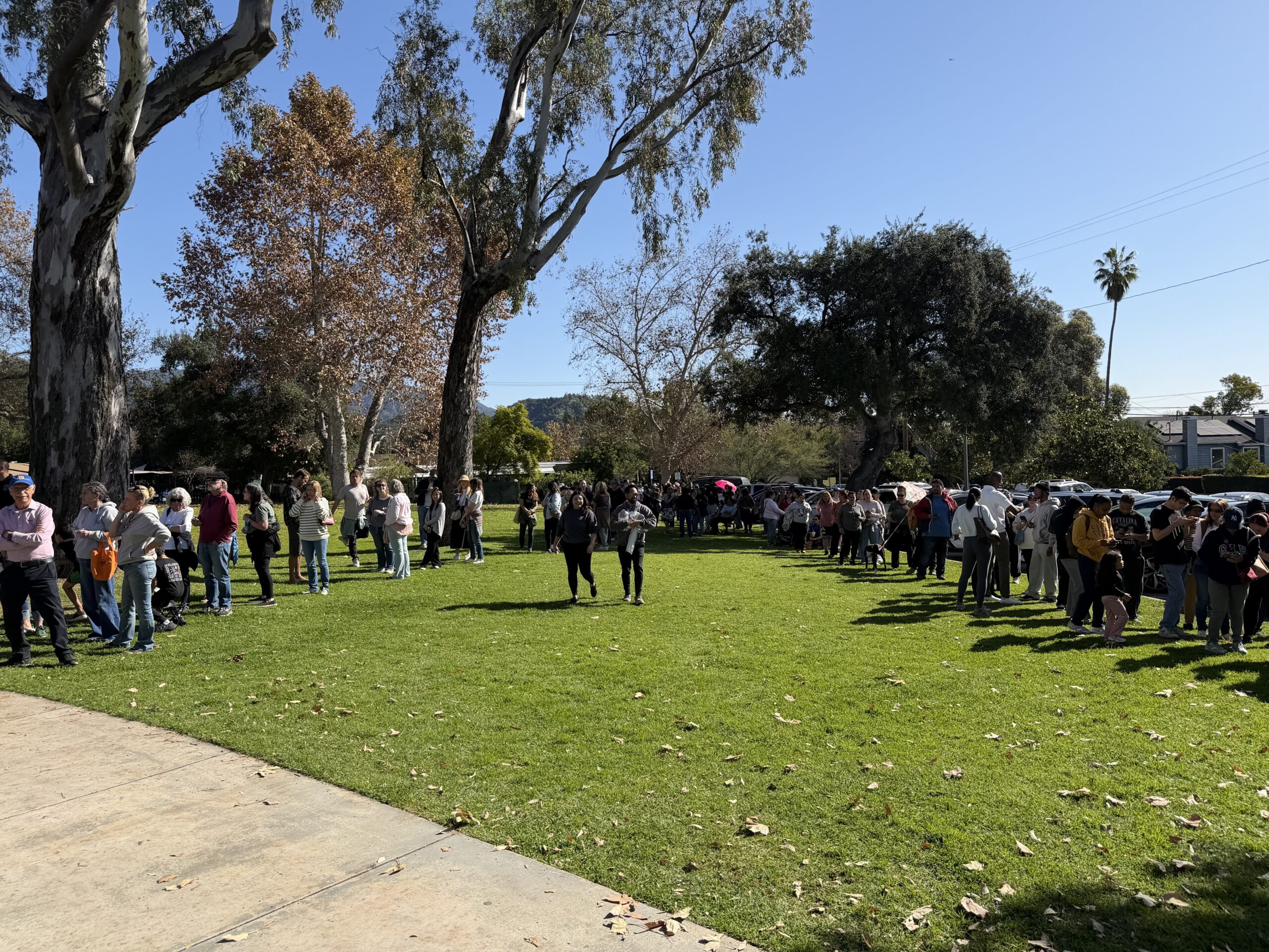 The event was for Palisades and Altadena survivors. People had to qualify for the event through their Y and with identification or a utility bill. There were probably about five hundred people lined up around a long grass yard/field, waiting.