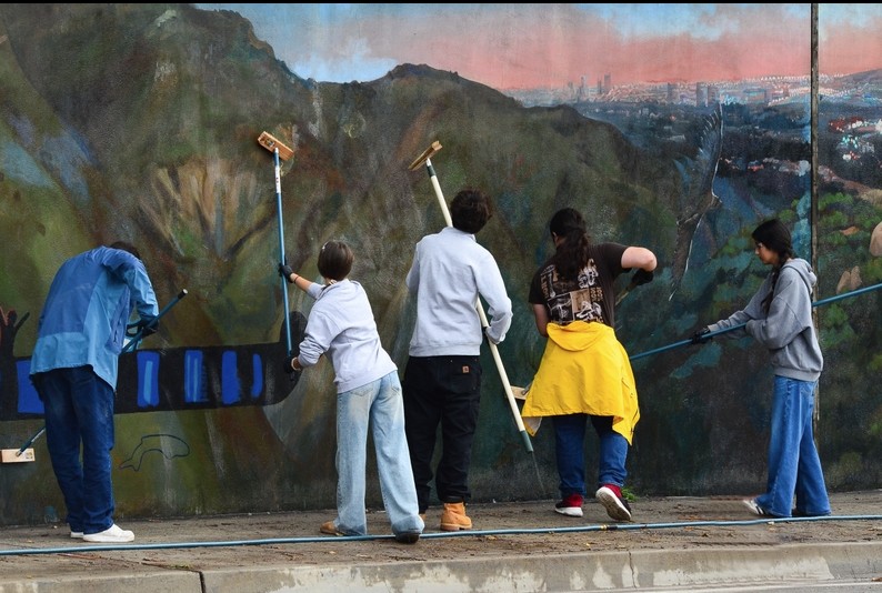 In the midst of heavy rains on November 15 and 16, volunteers stepped up and gave the iconic Temescal Mural a “bubble bath.” The gel bath was in preparation for refurbishing the 500-feet mural “History of the Palisades” that was painted in 1983.