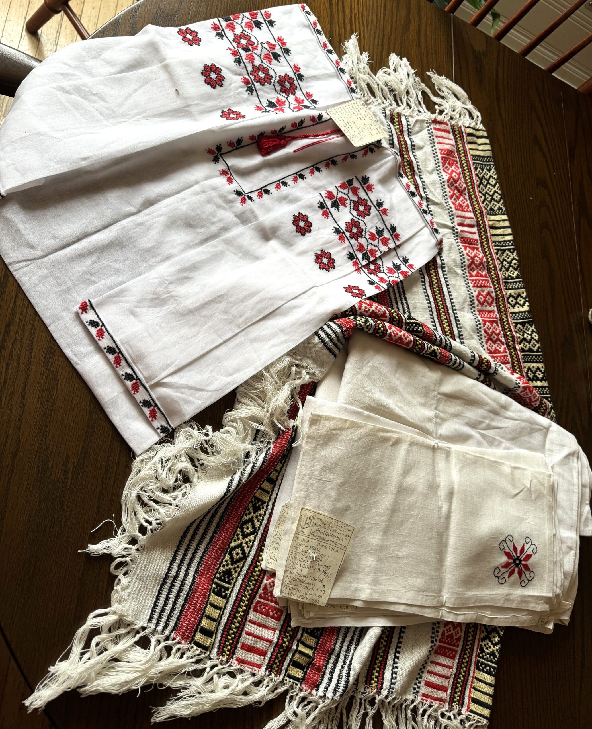 From the tags on the linens, and using the translator app, they are Ukrainian and look like they have never been used. Maybe they were a gift or souvenir that someone picked up when traveling to that country, prior to the war.
