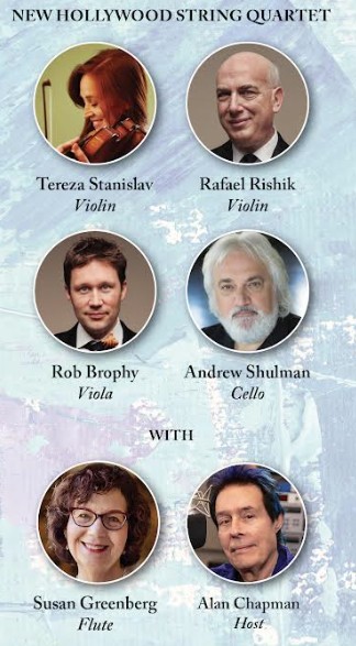 The program features the artistry of flutist Susan Greenberg and the award-winning Zelter String Quartet. Based in L.A., members include Kyle Gilner, Gallia Kastner, Carson Rick and Allan Hon