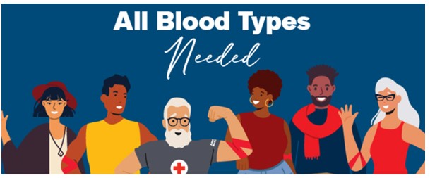 Donors can sign up to give blood – about a pint of “whole blood” is given and the blood donation takes about an hour. All blood types are needed.