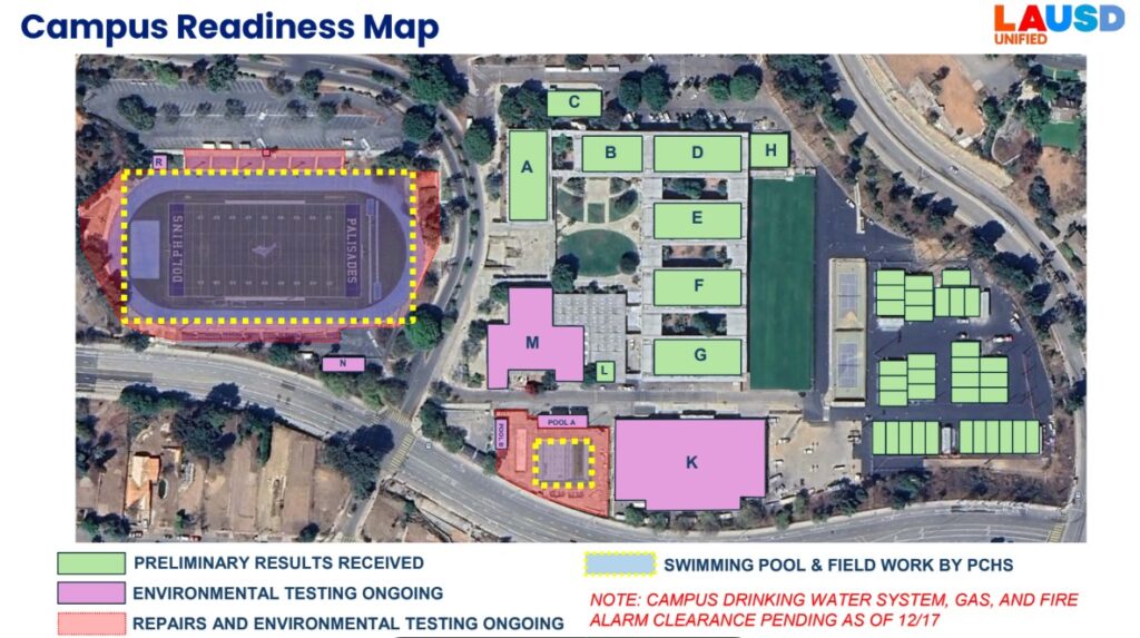 A summary of environmental testing results of Palisades High School will be presented to the community at 6 p.m. at a virtual meeting on Wednesday, January 21. The zoom link is lausd.zoom.us/j/88251697116 and the meeting ID is 882 5169 7116