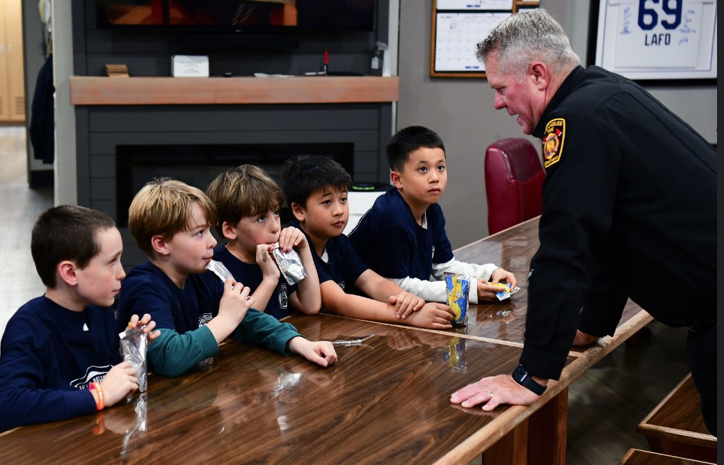 “Men, you’re now part of the fire department. Training begins immediately,” Capt. Brown seems to be saying to the birthday boy and his friends.