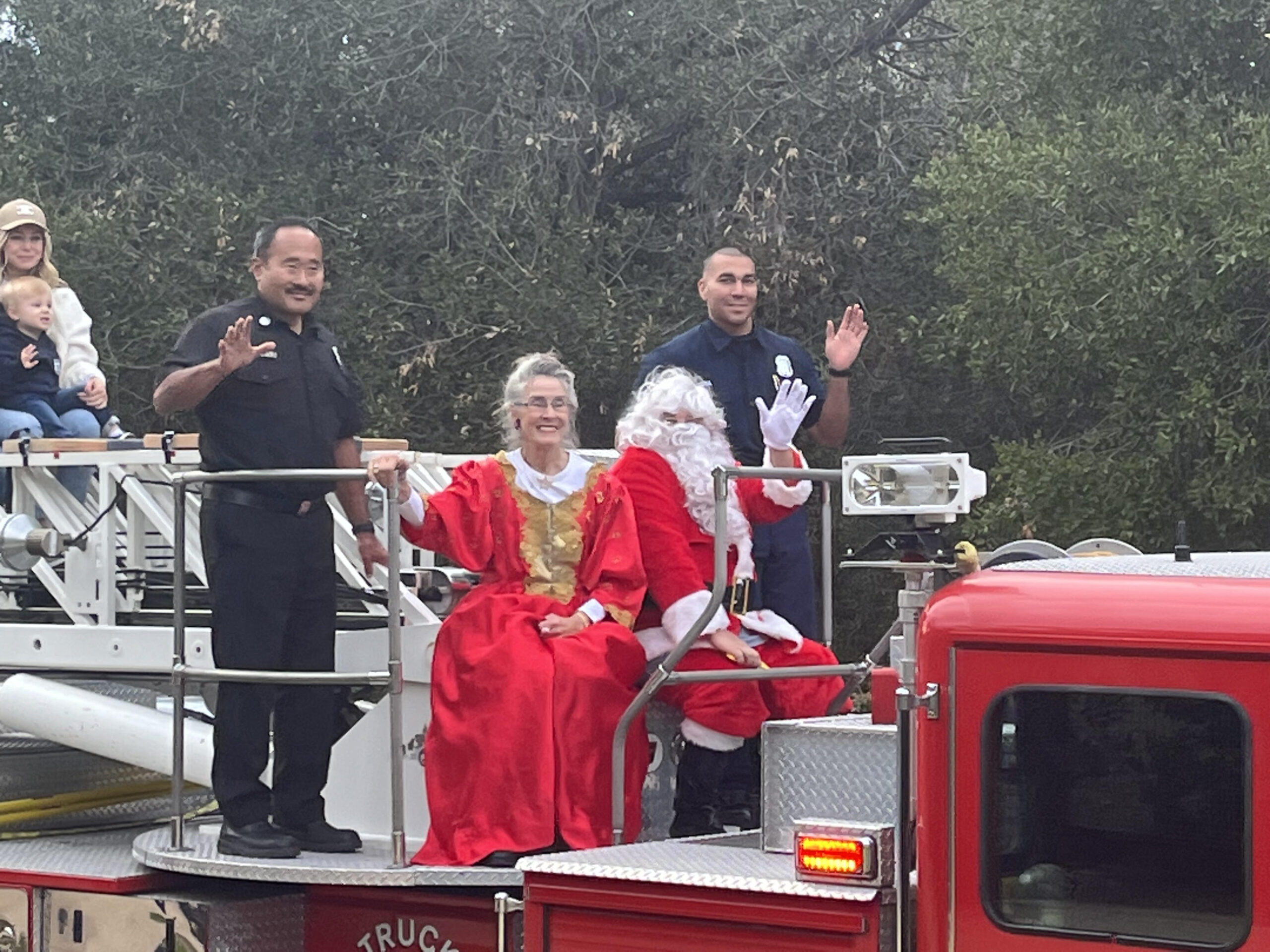LAFD Captain Eric Nakamaru (left) and firefighter Roman Vega (right), helped escort Mr. and Mrs. Santa Claus from Station 69 to Simon Meadow. Several youngsters won a chance to ride on the truck.